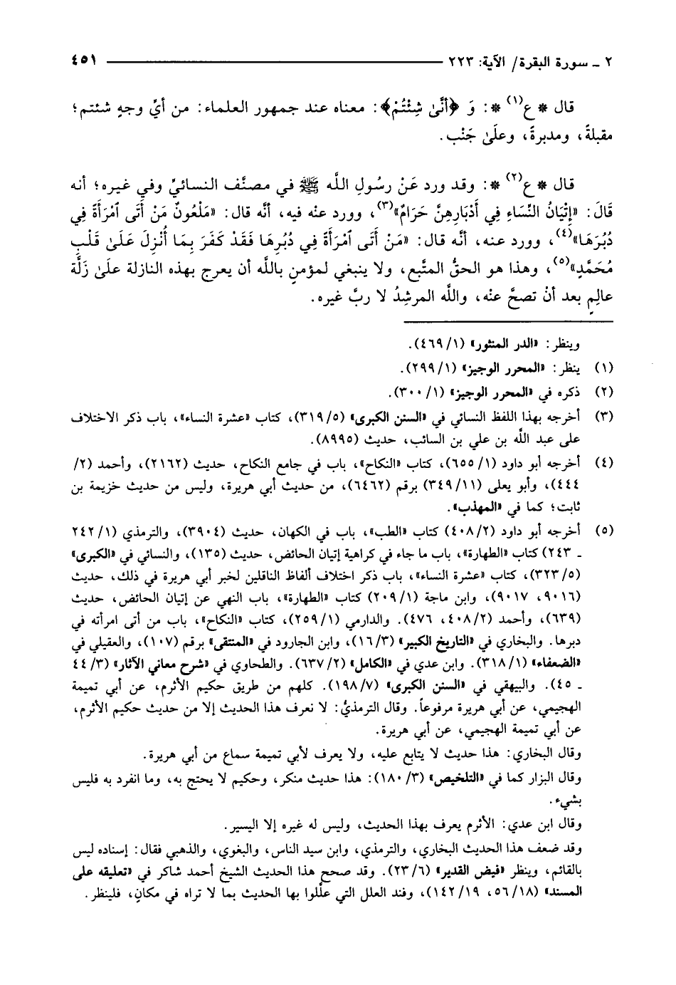 قال ع «2» : وقد ورد عن رسول الله صلّى الله عليه وسلم في مصنَّف النسائيِّ وفي غيره أنه قَالَ: «إِتْيَانُ النِّسَاءِ فِي أَدْبَارِهِنَّ حَرَامٌ» «3» ، وورد عنْه فيه، أنَّه قال: «مَلْعُونٌ مَنْ أَتَى امرأة فِي دُبُرَهَا» «4» ، وورد عنه، أنَّه قال: «مَنْ أَتَى امرأة فِي دُبُرِهَا فَقَدْ كَفَرَ بِمَا أُنْزِلَ على قَلْبِ مُحَمَّدٍ» «5» ، وهذا هو الحقُّ المتَّبع، ولا ينبغي لمؤمنٍ باللَّه أن يعرج بهذه النازلة على زَلَّة عالِمٍ بعد أنْ تصحَّ عنْه، واللَّه المرشِدُ لا ربَّ غيره.