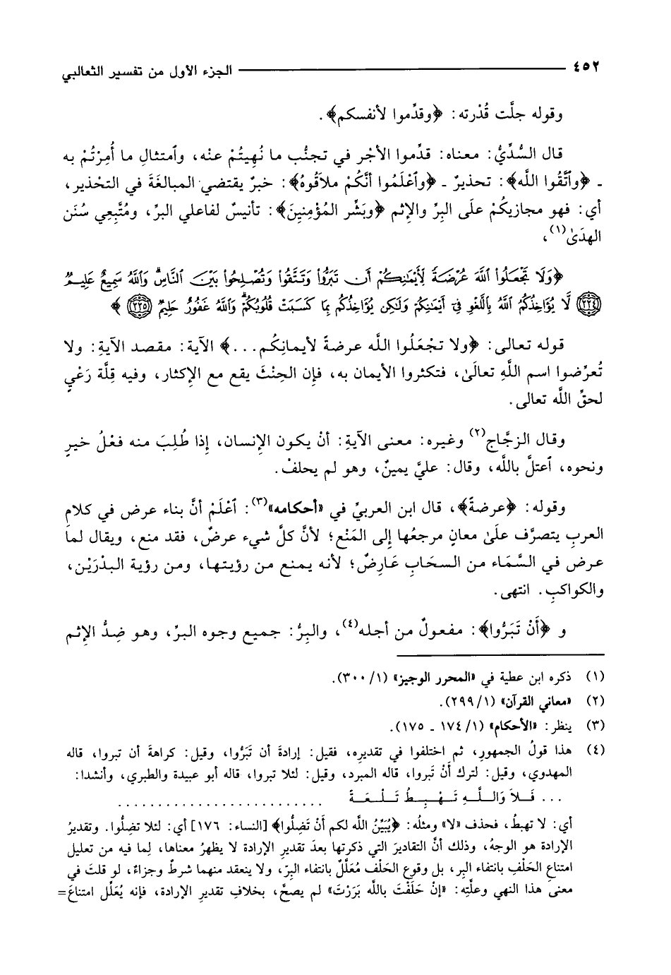 (4) هذا قول الجمهور، ثم اختلفوا في تقديره، فقيل: إرادة أن تبرّوا، وقيل: كراهة أن تبروا، قاله المهدوي، وقيل: لترك أن تبروا، قاله المبرد، وقيل: لئلا تبروا، قاله أبو عبيدة والطبري، وأنشدا: