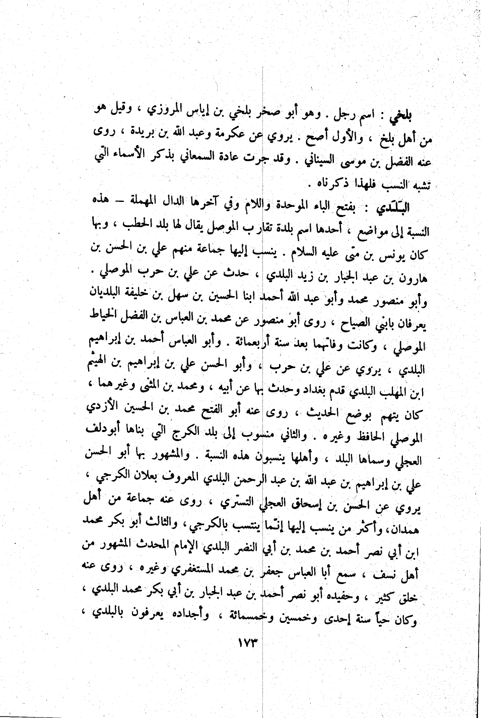 الْبَلَدِي بِفَتْح الْبَاء الْمُوَحدَة وَاللَّام وَفِي آخرهَا الدَّال الْمُهْملَة - هَذِه النِّسْبَة إِلَى مَوَاضِع أَحدهَا اسْم بَلْدَة تقَارب الْموصل يُقَال لَهَا بلد الْحَطب وَبهَا كَانَ يُونُس بن مَتى عَلَيْهِ السَّلَام ينْسب إِلَيْهَا جمَاعَة مِنْهُم عَليّ بن الْحسن بن هَارُون بن عبد الْجَبَّار بن زيد الْبَلَدِي حدث عَن عَليّ بن حَرْب الْموصِلِي وَأَبُو مَنْصُور مُحَمَّد وَأَبُو عبد الله أَحْمد ابْنا الْحُسَيْن بن سهل بن خَليفَة البلديان يعرفان بِابْني الصياح روى أَبُو مَنْصُور عَن مُحَمَّد بن الْعَبَّاس بن الْفضل الْخياط الْموصِلِي وَكَانَت وفاتهما بعد سنة أَرْبَعمِائَة وَأَبُو الْعَبَّاس أَحْمد بن إِبْرَاهِيم الْبَلَدِي يروي عَن عَليّ بن حَرْب وَأَبُو الْحسن عَليّ بن إِبْرَاهِيم بن الْهَيْثَم ابْن الْمُهلب الْبَلَدِي قدم بَغْدَاد وَحدث بهَا عَن أَبِيه وَمُحَمّد بن الْمثنى وَغَيرهمَا كَانَ يتهم بِوَضْع الحَدِيث روى عَنهُ أَبُو الْفَتْح مُحَمَّد بن الْحُسَيْن الْأَزْدِيّ الْموصِلِي الْحَافِظ وَغَيره وَالثَّانِي مَنْسُوب إِلَى بلد الكرج الَّتِي بناها أَبُو دلف الْعجلِيّ وسماها الْبَلَد وَأَهْلهَا ينسبون هَذِه النِّسْبَة وَالْمَشْهُور بهَا أَبُو الْحسن عَليّ بن إِبْرَاهِيم بن عبد الله بن عبد الرَّحْمَن الْبَلَدِي الْمَعْرُوف بعلان الكرجي يروي عَن الْحسن بن إِسْحَاق الْعجلِيّ التسترِي روى عَنهُ جمَاعَة من أهل هَمدَان وَأكْثر من ينْسب إِلَيْهَا إِنَّمَا ينتسب بالكرجي وَالثَّالِث أَبُو بكر مُحَمَّد ابْن أبي نصر أَحْمد بن مُحَمَّد بن أبي النَّضر الْبَلَدِي الإِمَام الْمُحدث الْمَشْهُور من أهل نسف سمع أَبَا الْعَبَّاس جَعْفَر بن مُحَمَّد المستغفري وَغَيره روى عَنهُ خلق كثير وحفيده أَبُو نصر احْمَد بن عبد الْجَبَّار بن ابي بكر مُحَمَّد الْبَلَدِي وَكَانَ حَيا سنة إِحْدَى وَخمسين وَخَمْسمِائة وأجداده يعْرفُونَ بالبلدي