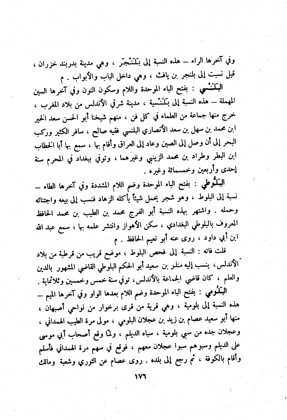 البلنسي بِفَتْح الْبَاء الْمُوَحدَة وَاللَّام وَسُكُون النُّون وَفِي آخرهَا السِّين الْمُهْملَة - هَذِه النِّسْبَة إِلَى بلنسية مَدِينَة شَرْقي الأندلس من بِلَاد الْمغرب خرج مِنْهَا جمَاعَة من الْعلمَاء فِي كل فن مِنْهُم شَيخنَا أَبُو الْحسن سعد الْخَيْر ابْن مُحَمَّد بن سهل بن سعد الْأنْصَارِيّ البلنسي فَقِيه صَالح سَافر الْكثير وَركب الْبَحْر إِلَى أَن وصل إِلَى الصين وَعَاد إِلَى الْعرَاق وَأقَام بهَا سمع بهَا أَبَا الْخطاب ابْن البطر وطراد بن مُحَمَّد الزَّيْنَبِي وَغَيرهمَا وَتُوفِّي بِبَغْدَاد فِي الْمحرم سنة إِحْدَى وَأَرْبَعين وَخَمْسمِائة وَغَيره