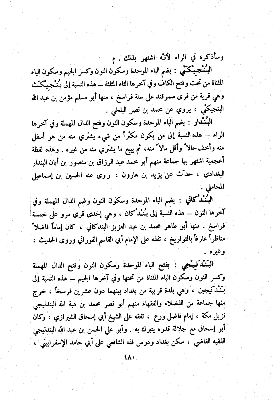 الْبَنْدَنِيجِيّ بِفَتْح الْبَاء الْمُوَحدَة وَسُكُون النُّون وَفتح الدَّال الْمُهْملَة وَكسر النُّون وَسُكُون الْيَاء الْمُثَنَّاة من تحتهَا وَفِي آخرهَا الْجِيم - هَذِه النِّسْبَة إِلَى بندنيجين وَهِي بَلْدَة قريبَة من بَغْدَاد بَينهمَا دون عشْرين فرسخا خرج مِنْهَا جمَاعَة من الْفُضَلَاء وَالْفُقَهَاء مِنْهُم أَبُو نصر مُحَمَّد بن هبة الله الْبَنْدَنِيجِيّ نزيل مَكَّة إِمَام فَاضل ورع تفقه على الشَّيْخ ابي إِسْحَاق الشِّيرَازِيّ وَكَانَ أَبُو إِسْحَاق مَعَ جلالة قدره يتبرك بِهِ وَأَبُو عَليّ الْحسن بن عبد الله الْبَنْدَنِيجِيّ الْفَقِيه القَاضِي سكن بَغْدَاد ودرس فقه الشَّافِعِي على أبي حَامِد الإِسْفِرَايِينِيّ