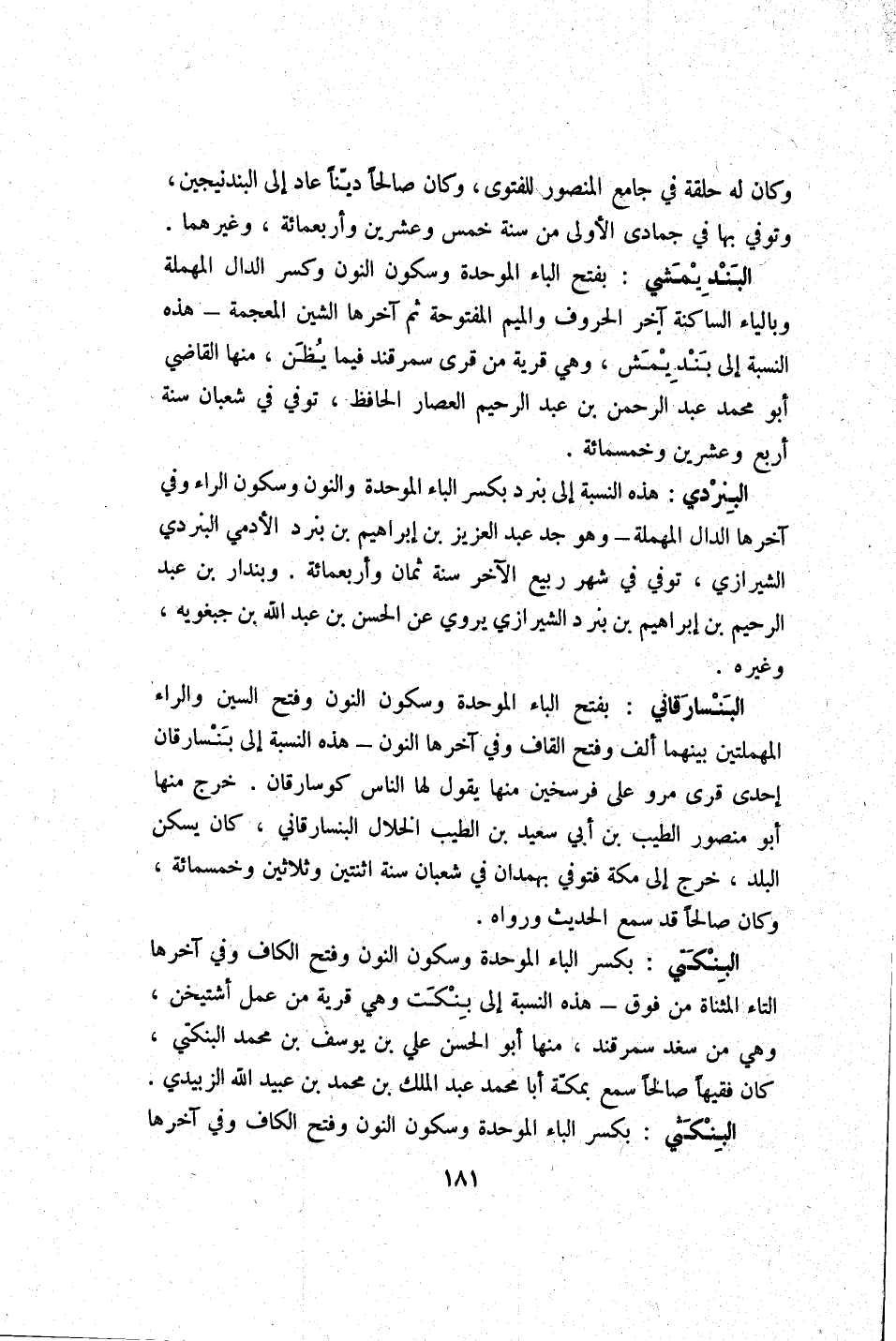 البنكتي بِكَسْر الْبَاء الْمُوَحدَة وَسُكُون النُّون وَفتح الْكَاف وَفِي آخرهَا التَّاء الْمُثَنَّاة من فَوق - هَذِه النِّسْبَة إِلَى بنكت وَهِي قَرْيَة من عمل أشتيخن وَهِي من سغد سَمَرْقَنْد مِنْهَا أَبُو الْحسن عَليّ بن يُوسُف بن مُحَمَّد البنكتي كَانَ فَقِيها صَالحا سمع بِمَكَّة أَبَا مُحَمَّد عبد الْملك بن مُحَمَّد بن عبيد الله الزبيدِيّ