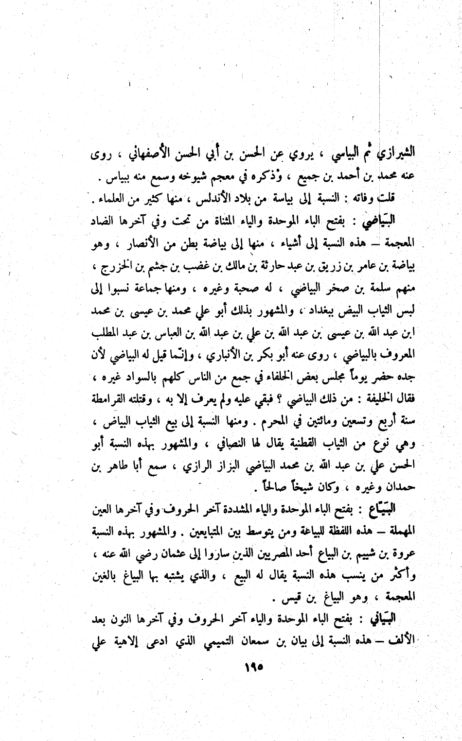 البياضي بِفَتْح الْبَاء الْمُوَحدَة وَالْيَاء الْمُثَنَّاة من تَحت وَفِي آخرهَا الضَّاد الْمُعْجَمَة - هَذِه النِّسْبَة إِلَى اشياء مِنْهَا إِلَى بياضة بطن من الْأَنْصَار وَهُوَ بياضة بن عَامر بن زُرَيْق بن عبد حَارِثَة بن مَالك بن غضب بن جشم بن الْخَزْرَج مِنْهُم سَلمَة بن صَخْر البياضي لَهُ صُحْبَة وَغَيره وَمِنْهَا جمَاعَة نسبوا إِلَى لبس الثِّيَاب الْبيض بِبَغْدَاد وَالْمَشْهُور بذلك أَبُو عَليّ مُحَمَّد بن عِيسَى بن مُحَمَّد ابْن عبد الله بن عِيسَى بن عبد الله بن عَليّ بن عبد الله بن الْعَبَّاس بن عبد الْمطلب الْمَعْرُوف بالبياضي روى عَنهُ أَبُو بكر بن الْأَنْبَارِي وَإِنَّمَا قيل لَهُ البياضي لِأَن جده حضر يَوْمًا مجْلِس بعض الْخُلَفَاء فِي جمع من النَّاس كلهم بِالسَّوَادِ غَيره فَقَالَ الْخَلِيفَة من ذَلِك البياضي فَبَقيَ عَلَيْهِ وَلم يعرف إِلَّا بِهِ وقتلته القرامطة سنة أَربع وَتِسْعين وَمِائَتَيْنِ فِي الْمحرم وَمِنْهَا النِّسْبَة إِلَى بيع الثِّيَاب الْبيَاض وَهِي نوع من الثِّيَاب القطنية يُقَال لَهَا النصافي وَالْمَشْهُور بِهَذِهِ النِّسْبَة أَبُو الْحسن عَليّ بن عبد الله بن مُحَمَّد البياضي الْبَزَّاز الرَّازِيّ سمع أَبَا طَاهِر بن حمدَان وَغَيره وَكَانَ شَيخا صَالحا