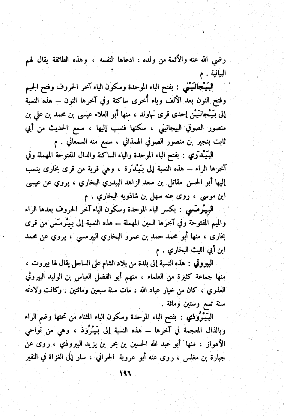 البيجانيني بِفَتْح الْبَاء الْمُوَحدَة وَسُكُون الْيَاء آخر الْحُرُوف وَفتح الْجِيم وَفتح النُّون بعد الْألف وياء أُخْرَى سَاكِنة وَفِي آخرهَا النُّون - هَذِه النِّسْبَة إِلَى بيجانين إِحْدَى قرى نهاوند مِنْهَا أَبُو الْعَلَاء عِيسَى بن مُحَمَّد بن عَليّ بن مَنْصُور الصُّوفِي البيجانيني سكنها فنسب إِلَيْهَا سمع الحَدِيث من أبي ثَابت بنجير بن مَنْصُور الصُّوفِي الهمذاني سمع مِنْهُ السَّمْعَانِيّ م
