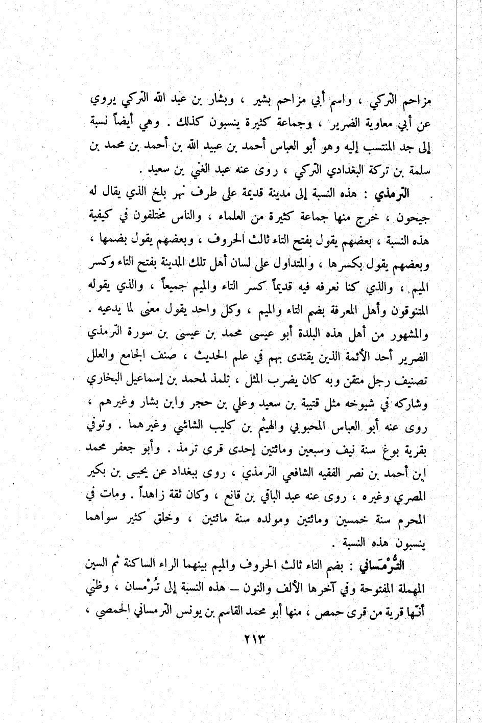 التِّرْمِذِيّ هَذِه النِّسْبَة إِلَى مَدِينَة قديمَة على طرف نهر بَلخ الَّذِي يُقَال لَهُ جيحون خرج مِنْهَا جمَاعَة كَثِيرَة من الْعلمَاء وَالنَّاس مُخْتَلفُونَ فِي كَيْفيَّة هَذِه النِّسْبَة بَعضهم يَقُول بِفَتْح التَّاء ثَالِث الْحُرُوف وَبَعْضهمْ يَقُول بضَمهَا وَبَعْضهمْ يَقُول بِكَسْرِهَا والمتداول على لِسَان أهل تِلْكَ الْمَدِينَة بِفَتْح التَّاء وَكسر الْمِيم وَالَّذِي كُنَّا نعرفه فِيهِ قَدِيما كسر التَّاء وَالْمِيم جَمِيعًا وَالَّذِي يَقُوله المتنوقون وَأهل الْمعرفَة بِضَم التَّاء وَالْمِيم وكل وَاحِد يَقُول معنى لما يَدعِيهِ وَالْمَشْهُور من أهل هَذِه الْبَلدة أَبُو عِيسَى مُحَمَّد بن عِيسَى بن سُورَة التِّرْمِذِيّ الضَّرِير أحد الْأَئِمَّة الَّذين يقْتَدى بهم فِي علم الحَدِيث صنف الْجَامِع والعلل تصنيف رجل متقن وَبِه كَانَ يضْرب الْمثل تلمذ لمُحَمد بن إِسْمَاعِيل البُخَارِيّ وشاركه فِي شُيُوخه مثل قُتَيْبَة بن سعيد بن عَليّ بن حجر وَابْن بشار وَغَيرهم روى عَنهُ أَبُو الْعَبَّاس المحبوبي والهيثم بن كُلَيْب الشَّاشِي وَغَيرهمَا وَتُوفِّي بقرية بوغ سنة نَيف وَسبعين وَمِائَتَيْنِ إِحْدَى قرى ترمذ وَأَبُو جَعْفَر مُحَمَّد ابْن أَحْمد بن نصر الْفَقِيه الشَّافِعِي التِّرْمِذِيّ روى بِبَغْدَاد عَن يحيى بن بكير الْمصْرِيّ وَغَيره روى عَنهُ عبد الْبَاقِي بن قَانِع وَكَانَ ثِقَة زاهدا وَمَات فِي الْمحرم سنة خمسين وَمِائَتَيْنِ ومولده سنة مِائَتَيْنِ وَخلق كثير سواهُمَا ينسبون هَذِه النِّسْبَة
