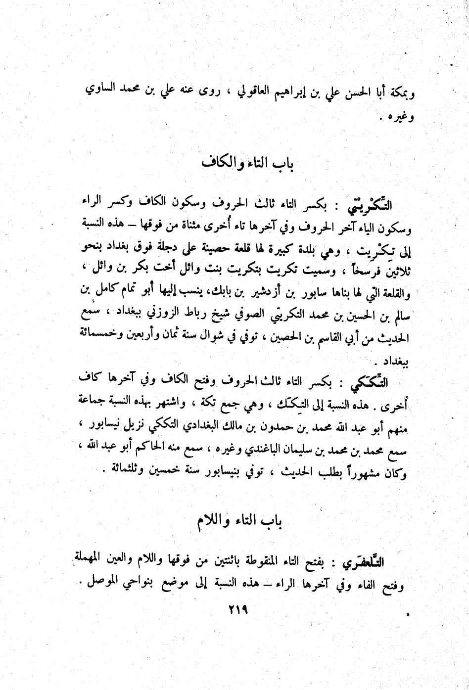 التكريتي بِكَسْر التَّاء ثَالِث الْحُرُوف وَسُكُون الْكَاف وَكسر الرَّاء وَسُكُون الْيَاء آخر الْحُرُوف وَفِي آخرهَا تَاء أُخْرَى مثناة من فَوْقهَا - هَذِه النِّسْبَة إِلَى تكريت وَهِي بَلْدَة كَبِيرَة لَهَا قلعة حَصِينَة على دجلة فَوق بَغْدَاد بِنَحْوِ ثَلَاثِينَ فرسخا وَسميت تكريت بتكريت بنت وَائِل أُخْت بكر بن وَائِل والقلعة الَّتِي لَهَا بناها سَابُور بن أزدشير بن بابك ينْسب إِلَيْهَا أَبُو تَمام كَامِل بن سَالم بن الْحُسَيْن بن مُحَمَّد التكريتي الصُّوفِي شيخ رِبَاط الزوزني بِبَغْدَاد سمع الحَدِيث من أبي الْقَاسِم بن الْحصين توفّي فِي شَوَّال سنة ثَمَان وَأَرْبَعين وَخَمْسمِائة بِبَغْدَاد