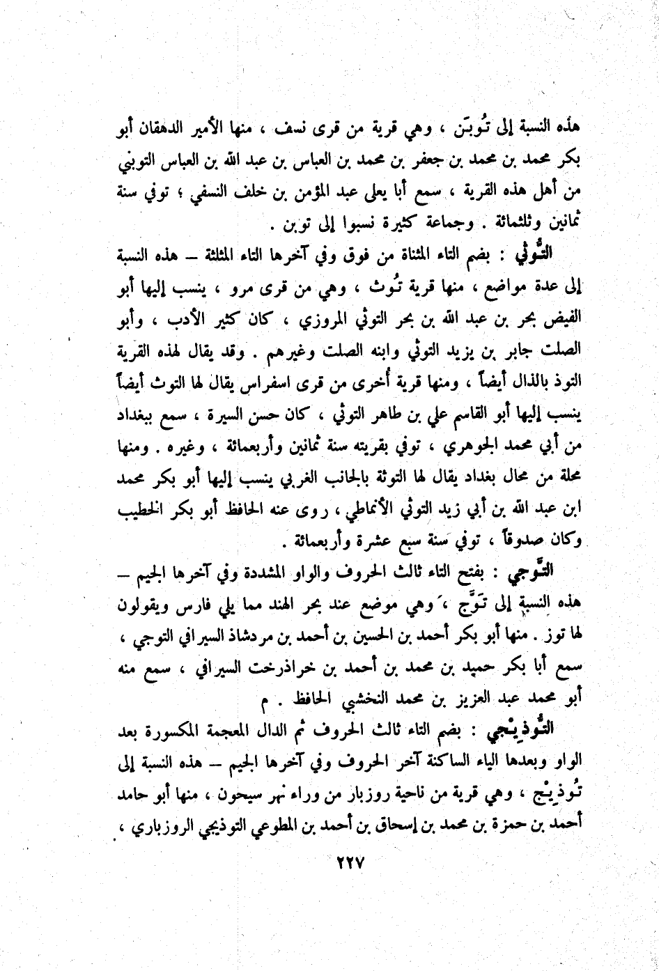 التوثي بِضَم التَّاء الْمُثَنَّاة من فَوق وَفِي آخرهَا التَّاء الْمُثَلَّثَة - هَذِه النِّسْبَة إِلَى عدَّة مَوَاضِع مِنْهَا قَرْيَة توث وَهِي من قرى مرو ينْسب إِلَيْهَا أَبُو الْفَيْض بَحر بن عبد الله بن بَحر التوثي الْمروزِي كَانَ كثير الْأَدَب وَأَبُو الصَّلْت جَابر بن يزِيد التوثي وَابْنه الصَّلْت وَغَيرهم وَقد يُقَال لهَذِهِ الْقرْيَة التوذ بِالذَّالِ أَيْضا وَمِنْهَا قَرْيَة أُخْرَى من قرى اسفراس يُقَال لَهَا التوث ايضا ينْسب إِلَيْهَا أَبُو الْقَاسِم عَليّ بن طَاهِر التوثي كَانَ حسن السِّيرَة سمع بِبَغْدَاد من أبي مُحَمَّد الْجَوْهَرِي توفّي بقريته سنة ثَمَانِينَ وَأَرْبَعمِائَة وَغَيره وَمِنْهَا محلّة من محَال بَغْدَاد يُقَال لَهَا التوثة بالجانب الغربي ينْسب إِلَيْهَا أَبُو بكر مُحَمَّد ابْن عبد الله بن أبي زيد التوثي الْأنمَاطِي روى عَنهُ الْحَافِظ أَبُو بكر الْخَطِيب وَكَانَ صَدُوقًا توفّي سنة سبع عشرَة وَأَرْبَعمِائَة