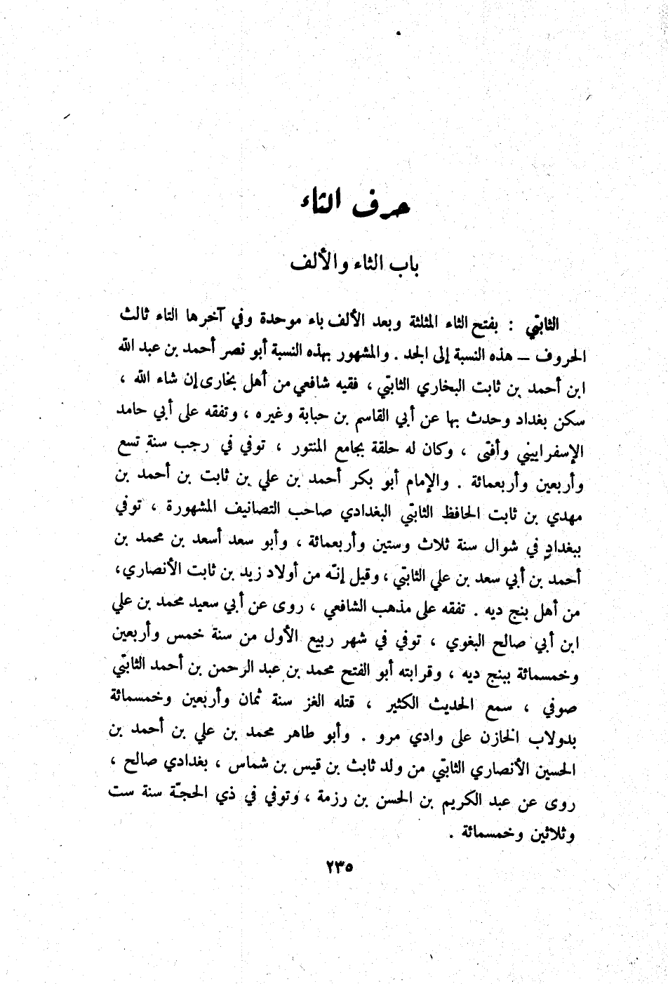 الثابتي بِفَتْح الثَّاء الْمُثَلَّثَة وَبعد الْألف بَاء مُوَحدَة وَفِي آخرهَا التَّاء ثَالِث الْحُرُوف - هَذِه النِّسْبَة إِلَى الْجد وَالْمَشْهُور بِهَذِهِ النِّسْبَة أَبُو نصر أَحْمد بن عبد الله ابْن أَحْمد بن ثَابت البُخَارِيّ الثابتي فَقِيه شَافِعِيّ من أهل بُخَارى إِن شَاءَ الله سكن بَغْدَاد وَحدث بهَا عَن أبي الْقَاسِم بن حبابة وَغَيره وتفقه على أبي حَامِد الإِسْفِرَايِينِيّ وَأفْتى وَكَانَ لَهُ حَلقَة بِجَامِع المنتور توفّي فِي رَجَب سنة تسع وَأَرْبَعين وَأَرْبَعمِائَة وَالْإِمَام أَبُو بكر أَحْمد بن عَليّ بن ثَابت بن أَحْمد بن مهْدي بن ثَابت الْحَافِظ الثابتي الْبَغْدَادِيّ صَاحب التصانيف الْمَشْهُورَة توفّي بِبَغْدَاد فِي شَوَّال سنة ثَلَاث وَسِتِّينَ وَأَرْبَعمِائَة وَأَبُو سعد أسعد بن مُحَمَّد بن أَحْمد بن أبي سعد بن عَليّ الثابتي وَقيل إِنَّه من أَوْلَاد زيد بن ثَابت الْأنْصَارِيّ من أهل بنج ديه تفقه على مَذْهَب الشَّافِعِي روى عَن أبي سعيد مُحَمَّد بن عَليّ ابْن أبي صَالح الْبَغَوِيّ توفّي فِي شهر ربيع الأول من سنة خمس وَأَرْبَعين وَخَمْسمِائة ببنج ديه وقرابته أَبُو الْفَتْح مُحَمَّد بن عبد الرَّحْمَن بن أَحْمد الثابتي صوفي سمع الحَدِيث الْكثير قَتله الغز سنة ثَمَان وَأَرْبَعين وَخَمْسمِائة بدولاب الخازن على وَادي مرو وَأَبُو طَاهِر مُحَمَّد بن عَليّ بن أَحْمد بن الْحُسَيْن الْأنْصَارِيّ الثاتبي من ولد ثَابت بن قيس بن شماس بغدادي صَالح روى عَن عبد الْكَرِيم بن الْحسن بن رزمة وَتُوفِّي فِي ذِي الْحجَّة سنة سِتّ وَثَلَاثِينَ وَخَمْسمِائة