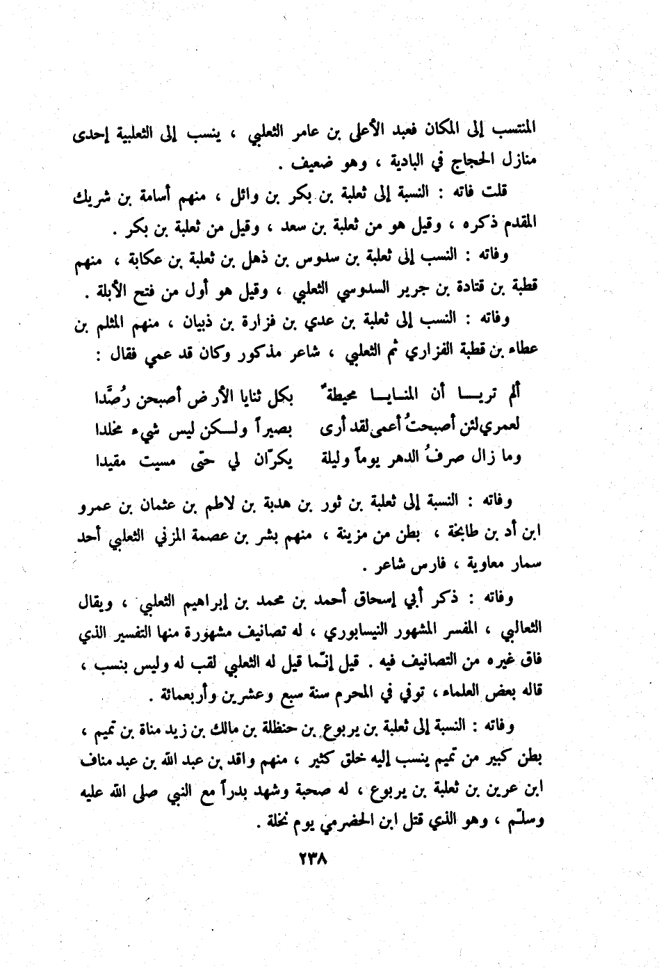 قلت فَاتَهُ النِّسْبَة إِلَى ثَعْلَبَة بن بكر بن وَائِل مِنْهُم أُسَامَة بن شريك الْمُقدم ذكره وَقيل هُوَ من ثَعْلَبَة بن سعد وَقيل من ثَعْلَبَة بن بكر