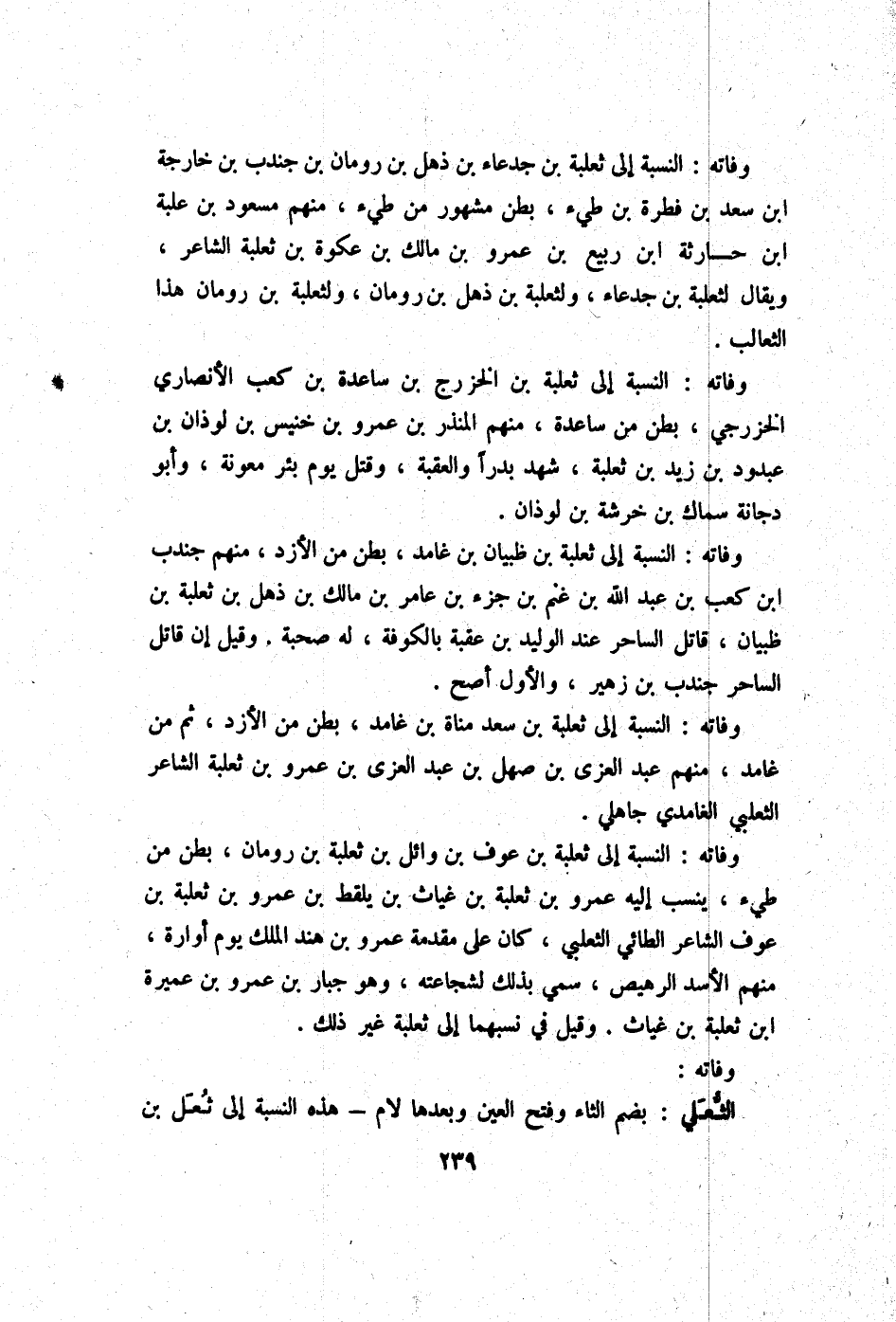 وَفَاته النِّسْبَة إِلَى ثَعْلَبَة بن عَوْف بن وَائِل بن ثَعْلَبَة بن رُومَان بطن من طَيء ينْسب إِلَيْهِ عَمْرو بن ثَعْلَبَة بن غياث بن يلقط بن عَمْرو بن ثَعْلَبَة بن عَوْف الشَّاعِر الطَّائِي الثَّعْلَبِيّ كَانَ على مُقَدّمَة عَمْرو بن هِنْد الْملك يَوْم أوارة مِنْهُم الْأسد الرهيص سمي بذلك لشجاعته وَهُوَ جَبَّار بن عَمْرو بن عميرَة ابْن ثَعْلَبَة بن غياث وَقيل فِي نسبهما إِلَى ثَعْلَبَة غير ذَلِك