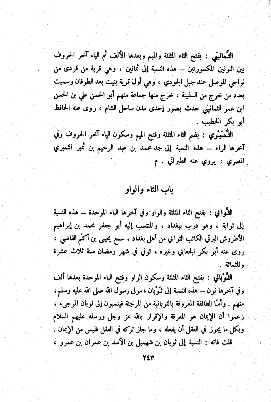 الثوباني بِفَتْح الثَّاء الْمُثَلَّثَة وَسُكُون الْوَاو وَفتح الْبَاء الْمُوَحدَة بعْدهَا ألف وَفِي آخرهَا نون - هَذِه النِّسْبَة إِلَى ثَوْبَان مولى رَسُول الله صلى الله عَلَيْهِ وَسلم مِنْهُم وَأما الطَّائِفَة الْمَعْرُوفَة بالثوبانية من المرجئة فينسبون إِلَى ثَوْبَان المرجئ زَعَمُوا أَن الْإِيمَان هُوَ الْمعرفَة وَالْإِقْرَار بِاللَّه عز وَجل وَرُسُله عَلَيْهِم السَّلَام وَبِكُل مَا يجوز فِي الْعقل أَن يَفْعَله وَمَا جَازَ تَركه فِي الْعقل فَلَيْسَ من الْإِيمَان