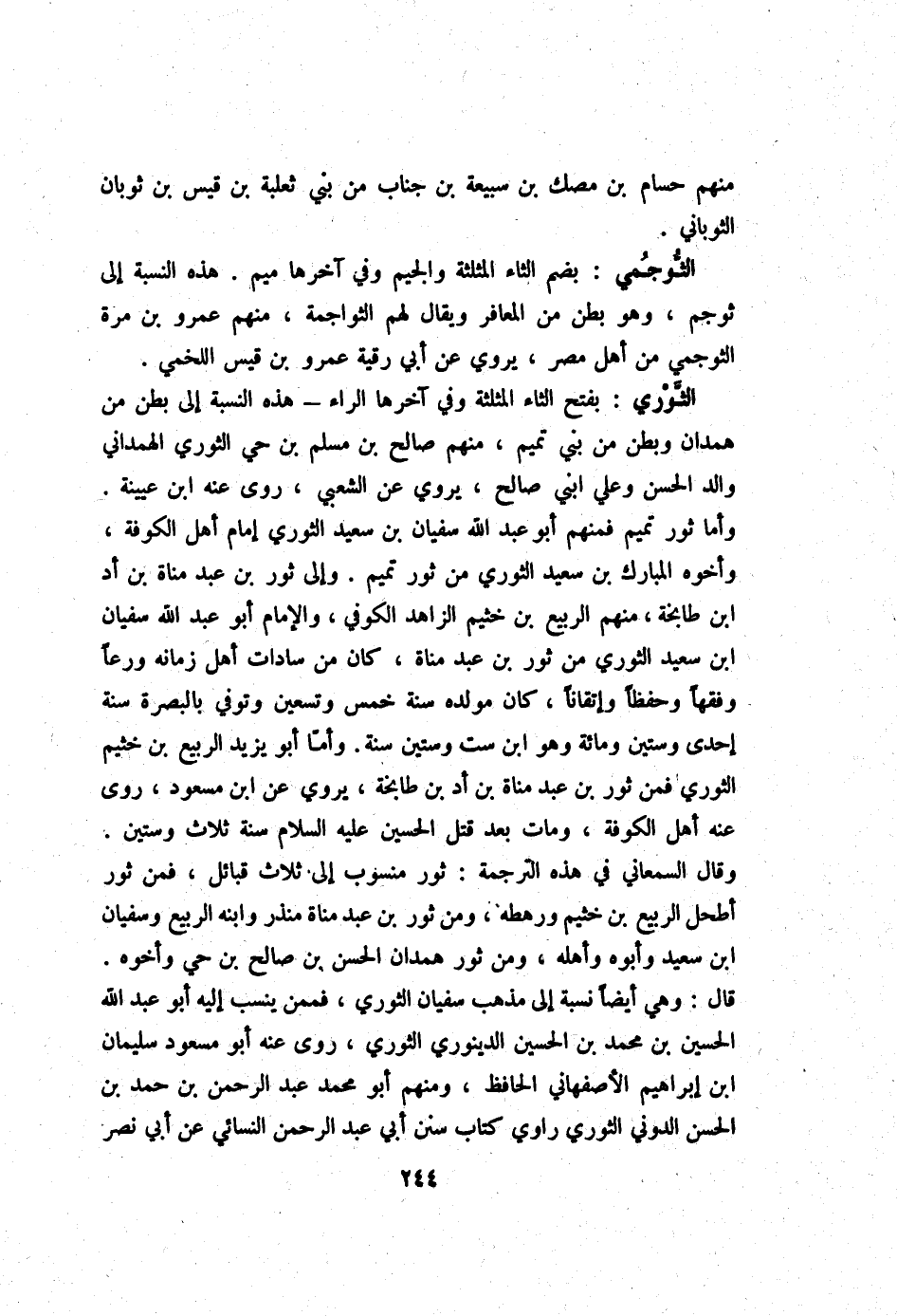 الثَّوْريّ بِفَتْح الثَّاء الْمُثَلَّثَة وَفِي آخرهَا الرَّاء - هَذِه النِّسْبَة إِلَى بطن من هَمدَان وبطن من بني تَمِيم مِنْهُم صَالح بن مُسلم بن حَيّ الثَّوْريّ الْهَمدَانِي وَالِد الْحسن وَعلي ابْني صَالح يروي عَن الشّعبِيّ روى عَنهُ ابْن عُيَيْنَة وَأما ثَوْر تَمِيم فَمنهمْ أَبُو عبد الله سُفْيَان بن سعيد الثَّوْريّ إِمَام أهل الْكُوفَة وَأَخُوهُ الْمُبَارك بن سعيد الثَّوْريّ من ثَوْر تَمِيم وَإِلَى ثَوْر بن عبد مَنَاة بن أد ابْن طابخة مِنْهُم الرّبيع بن خثيم الزَّاهِد الْكُوفِي وَالْإِمَام أَبُو عبد الله سُفْيَان ابْن سعيد الثَّوْريّ من ثَوْر بن عبد مَنَاة كَانَ من سَادَات أهل زَمَانه ورعا وفقها وحفظا وإتقانا كَانَ مولده سنة خمس وَتِسْعين وَتُوفِّي بِالْبَصْرَةِ سنة إِحْدَى وَسِتِّينَ وَمِائَة وَهُوَ ابْن سِتّ وَسِتِّينَ سنة وَأما أَبُو يزِيد الرّبيع بن خثيم الثَّوْريّ فَمن ثَوْر بن عبد مَنَاة بن أد بن طابخة يروي عَن ابْن مَسْعُود روى عَنهُ أهل الْكُوفَة وَمَات بعد قتل الْحُسَيْن عَلَيْهِ السَّلَام سنة ثَلَاث وَسِتِّينَ وَقَالَ السَّمْعَانِيّ فِي هَذِه التَّرْجَمَة ثَوْر مَنْسُوب إِلَى ثَلَاث قبائل فَمن ثَوْر أطحل الرّبيع بن خثيم ورهطه وَمن ثَوْر بن عبد مَنَاة مُنْذر وَابْنه الرّبيع وسُفْيَان ابْن سعيد وَأَبوهُ وَأَهله وَمن ثَوْر هَمدَان الْحسن بن صَالح بن حَيّ وَأَخُوهُ قَالَ وَهِي أَيْضا نِسْبَة إِلَى مَذْهَب سُفْيَان الثَّوْريّ فَمِمَّنْ ينْسب إِلَيْهِ أَبُو عبد الله الْحُسَيْن بن مُحَمَّد بن الْحُسَيْن الدينَوَرِي الثَّوْريّ روى عَنهُ أَبُو مَسْعُود سُلَيْمَان ابْن إِبْرَاهِيم الْأَصْفَهَانِي الْحَافِظ وَمِنْهُم أَبُو مُحَمَّد عبد الرَّحْمَن بن حمد بن الْحسن الدوني الثَّوْريّ رَاوِي كتاب سنَن أبي عبد الرَّحْمَن النَّسَائِيّ عَن أبي نصر