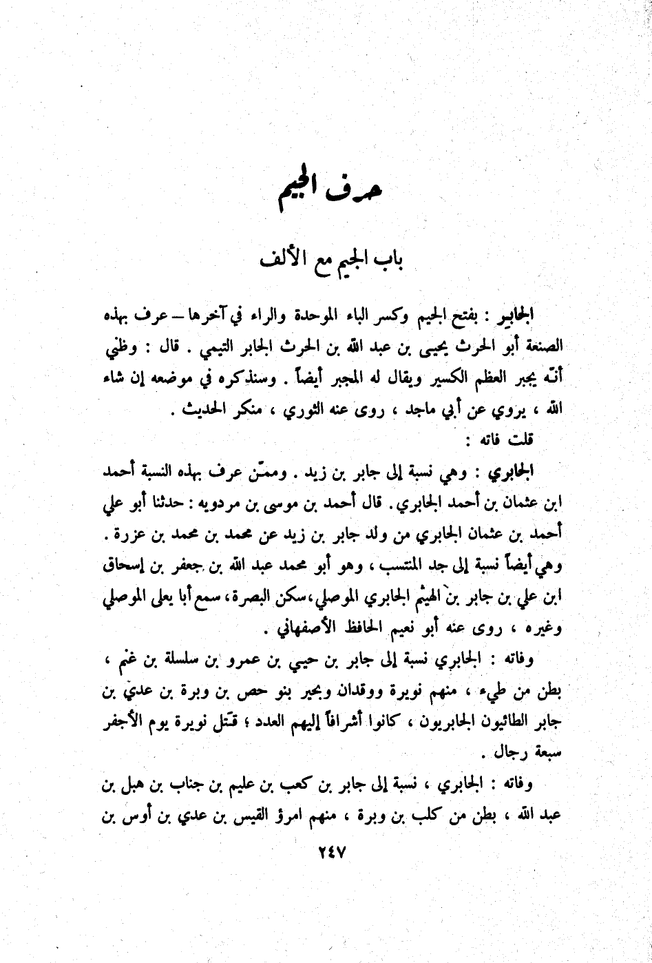 الجابري وَهِي نِسْبَة إِلَى جَابر بن زيد وَمِمَّنْ عرف بِهَذِهِ النِّسْبَة أَحْمد ابْن عُثْمَان بن أَحْمد الجابري قَالَ أَحْمد بن مُوسَى بن مرْدَوَيْه حَدثنَا أَبُو عَليّ أَحْمد بن عُثْمَان الجابري من ولد جَابر بن زيد عَن مُحَمَّد بن مُحَمَّد بن عزْرَة وَهِي أَيْضا نِسْبَة إِلَى جد المنتسب وَهُوَ أَبُو مُحَمَّد عبد الله بن جَعْفَر بن إِسْحَاق ابْن عَليّ بن جَابر بن الْهَيْثَم الجابري الْموصِلِي سكن الْبَصْرَة سمع أَبَا يعلى الْموصِلِي وَغَيره روى عَنهُ أَبُو نعيم الْحَافِظ الْأَصْفَهَانِي