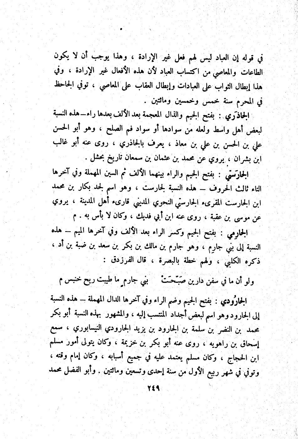 فِي قَوْله إِن الْعباد لَيْسَ لَهُم فعل غير الْإِرَادَة وَهَذَا يُوجب أَن لَا يكون الطَّاعَات والمعاصي من اكْتِسَاب الْعباد لِأَن هَذِه الْأَفْعَال غير الْإِرَادَة وَفِي هَذَا إبِْطَال الثَّوَاب على الْعِبَادَات وَإِبْطَال الْعقَاب على الْمعاصِي توفّي الجاحظ فِي الْمحرم سنة خمس وَخمسين وَمِائَتَيْنِ
