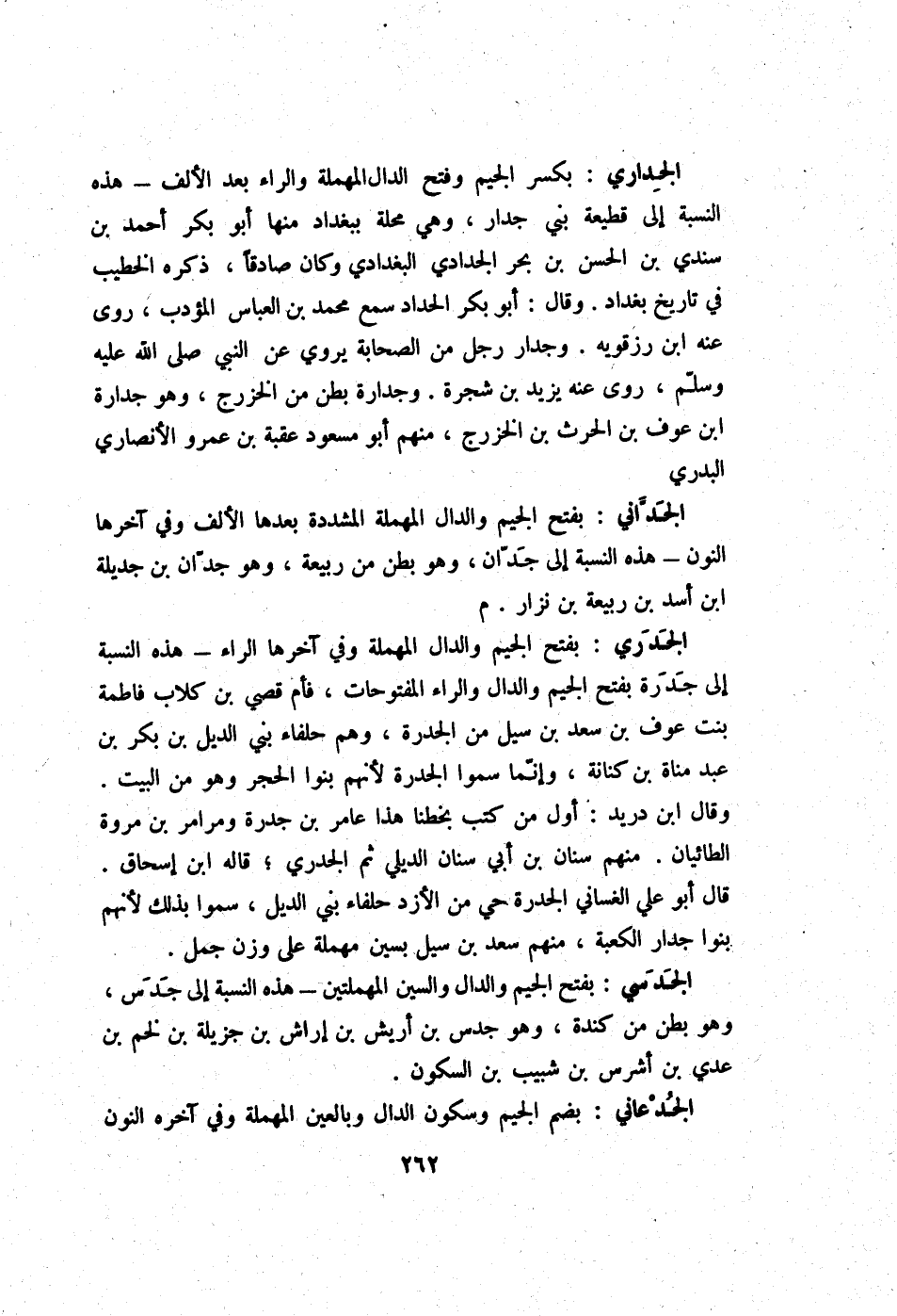 الجداري بِكَسْر الْجِيم وَفتح الدَّال الْمُهْملَة وَالرَّاء بعد الْألف - هَذِه النِّسْبَة إِلَى قطيعة بني جِدَار وَهِي محلّة بِبَغْدَاد مِنْهَا أَبُو بكر أَحْمد بن سندي بن الْحسن بن بَحر الجدادي الْبَغْدَادِيّ وَكَانَ صَادِقا ذكره الْخَطِيب فِي تَارِيخ بَغْدَاد وَقَالَ أَبُو بكر الْحداد سمع مُحَمَّد بن الْعَبَّاس الْمُؤَدب روى عَنهُ ابْن رزقويه وجدار رجل من الصَّحَابَة يروي عَن النَّبِي صلى الله عَلَيْهِ وَسلم روى عَنهُ يزِيد بن شَجَرَة وجدارة بطن من الْخَزْرَج وَهُوَ جدارة ابْن عَوْف بن الْحَرْث بن الْخَزْرَج مِنْهُم أَبُو مَسْعُود عقبَة بن عَمْرو الْأنْصَارِيّ البدري