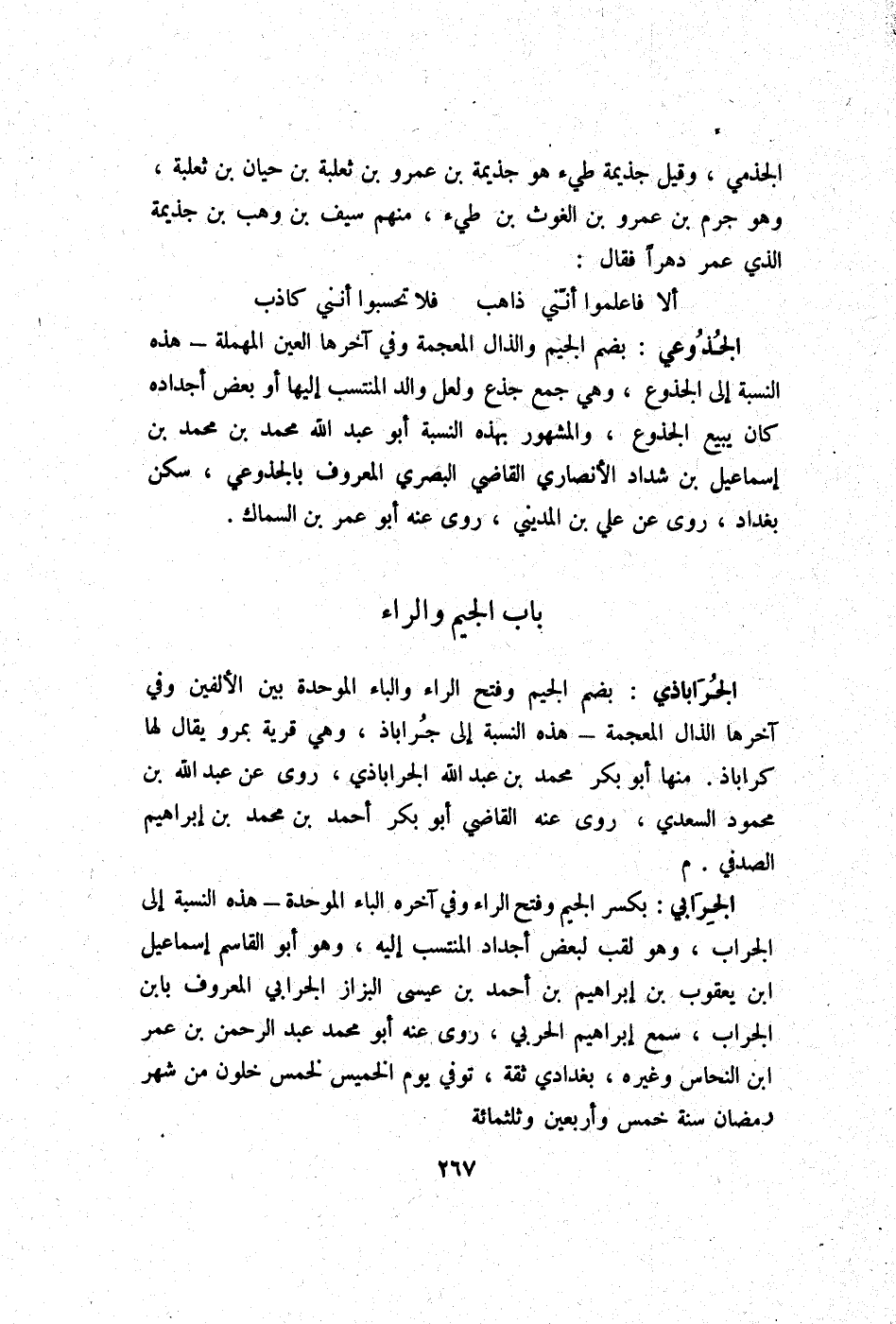 الجراباذي بِضَم الْجِيم وَفتح الرَّاء وَالْبَاء الْمُوَحدَة بَين الْأَلفَيْنِ وَفِي آخرهَا الذَّال الْمُعْجَمَة - هَذِه النِّسْبَة إِلَى جراباذ وَهِي قَرْيَة بمرو يُقَال لَهَا كراباذ مِنْهَا أَبُو بكر مُحَمَّد بن عبد الله الجراباذي روى عَن عبد الله بن مَحْمُود السَّعْدِيّ روى عَنهُ القَاضِي أَبُو بكر أَحْمد بن مُحَمَّد بن إِبْرَاهِيم الصَّدَفِي م