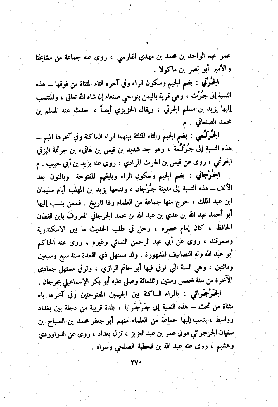 الْجِرْجَانِيّ بِضَم الْجِيم وَسُكُون الرَّاء وبالجيم الْمَفْتُوحَة وبالنون بعد الْألف - هَذِه النِّسْبَة إِلَى مَدِينَة جرجان وَفتحهَا يزِيد بن الْمُهلب أَيَّام سُلَيْمَان ابْن عبد الْملك خرج مِنْهَا جمَاعَة من الْعلمَاء وَلها تَارِيخ فَمِمَّنْ ينْسب إِلَيْهَا أَبُو أَحْمد عبد الله بن عدي بن عبد الله بن مُحَمَّد الْجِرْجَانِيّ الْمَعْرُوف بِابْن الْقطَّان الْحَافِظ كَانَ إِمَام عصره رَحل فِي طلب الحَدِيث مَا بَين الاسكندرية وسمرقند روى عَن أبي عبد الرَّحْمَن النَّسَائِيّ وَغَيره روى عَنهُ الْحَاكِم أَبُو عبد الله وَله التصانيف الْمَشْهُورَة ولد مستهل ذِي الْقعدَة سنة سبع وَسبعين وَمِائَتَيْنِ وَهِي السّنة الَّتِي توفّي فِيهَا أَبُو حَاتِم الرَّازِيّ وَتُوفِّي مستهل جُمَادَى الْآخِرَة من سنة خمس وَسِتِّينَ وثلثمائة وَصلى عَلَيْهِ أَبُو بكر الْإِسْمَاعِيلِيّ بجرجان