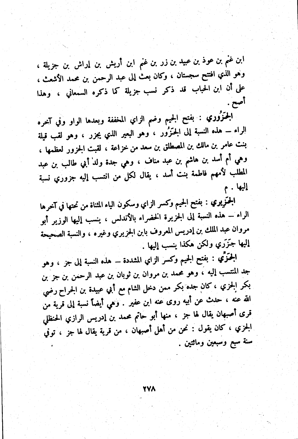 الجزي بِفَتْح الْجِيم وَكسر الزَّاي الْمُشَدّدَة - هَذِه النِّسْبَة إِلَى جز وَهُوَ جد المنتسب إِلَيْهِ وَهُوَ مُحَمَّد بن مَرْوَان بن ثَوْبَان بن عبد الرَّحْمَن بن جز بن بكر الجزي كَانَ جده بكر مِمَّن دخل الشَّام مَعَ أبي عُبَيْدَة بن الْجراح رَضِي الله عَنهُ حدث عَن أَبِيه روى عَنهُ ابْن عفير وَهِي أَيْضا نِسْبَة إِلَى قَرْيَة من قرى أَصْبَهَان يُقَال لَهَا جز مِنْهَا أَبُو حَاتِم مُحَمَّد بن إِدْرِيس الرَّازِيّ الْحَنْظَلِي الجزي كَانَ يَقُول نَحن من أهل أَصْبَهَان من قَرْيَة يُقَال لَهَا جز توفّي سنة سبع وَسبعين وَمِائَتَيْنِ