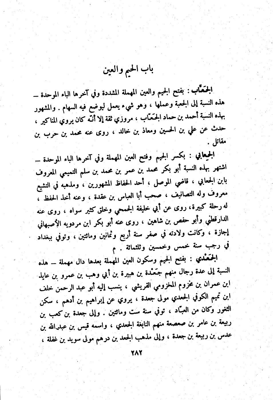 الجعاب بِفَتْح الْجِيم وَالْعين الْمُهْملَة الْمُشَدّدَة وَفِي آخرهَا الْبَاء الْمُوَحدَة - هَذِه النِّسْبَة إِلَى الجعبة وعملها وَهُوَ شَيْء يعْمل ليوضع فِيهِ السِّهَام وَالْمَشْهُور بِهَذِهِ النِّسْبَة أَحْمد بن حَمَّاد الجعاب مروزي ثِقَة إِلَّا أَنه كَانَ يروي الْمَنَاكِير حدث عَن عَليّ بن الْحُسَيْن ومعاذ بن خَالِد روى عَنهُ مُحَمَّد بن حَرْب بن مقَاتل