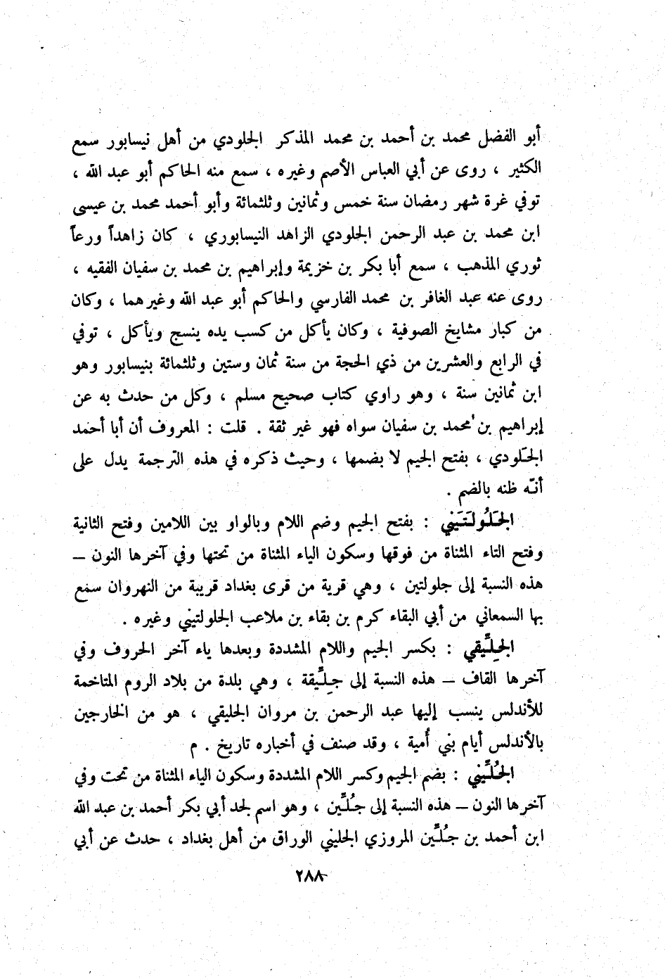 أَبُو الْفضل مُحَمَّد بن أَحْمد بن مُحَمَّد الْمُذكر الجلودي من أهل نيسابور سمع الْكثير روى عَن أبي الْعَبَّاس الْأَصَم وَغَيره سمع مِنْهُ الْحَاكِم أَبُو عبد الله توفّي غرَّة شهر رَمَضَان سنة خمس وَثَمَانِينَ وثلثمائة وَأَبُو أَحْمد مُحَمَّد بن عِيسَى ابْن مُحَمَّد بن عبد الرَّحْمَن الجلودي الزَّاهِد النَّيْسَابُورِي كَانَ زاهدا ورعا ثوري الْمَذْهَب سمع أَبَا بكر بن خُزَيْمَة وَإِبْرَاهِيم بن مُحَمَّد بن سُفْيَان الْفَقِيه روى عَنهُ عبد الغافر بن مُحَمَّد الْفَارِسِي وَالْحَاكِم أَبُو عبد الله وَغَيرهمَا وَكَانَ من كبار مَشَايِخ الصُّوفِيَّة وَكَانَ يَأْكُل من كسب يَده ينسج وَيَأْكُل توفّي فِي الرَّابِع وَالْعِشْرين من ذِي الْحجَّة من سنة ثَمَان وَسِتِّينَ وثلثمائة بنيسابور وَهُوَ ابْن ثَمَانِينَ سنة وَهُوَ رَاوِي كتاب صَحِيح مُسلم وكل من حدث بِهِ عَن إِبْرَاهِيم بن مُحَمَّد بن سُفْيَان سواهُ فَهُوَ غير ثِقَة قلت الْمَعْرُوف أَن أَبَا أَحْمد الجلودي بِفَتْح الْجِيم لَا بضَمهَا وَحَيْثُ ذكره فِي هَذِه التَّرْجَمَة يدل على أَنه ظَنّه بِالضَّمِّ