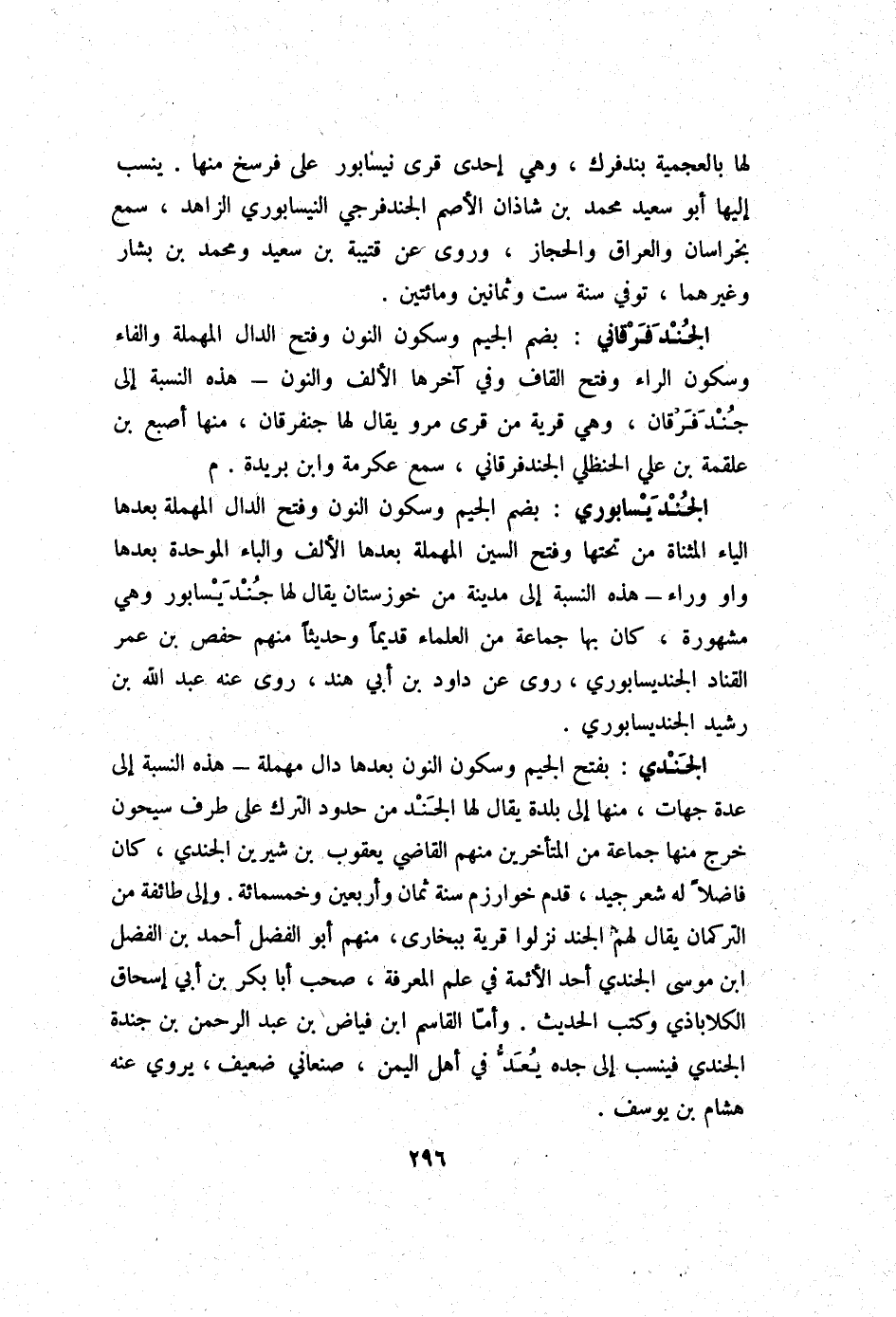 الجندي بِفَتْح الْجِيم وَسُكُون النُّون بعْدهَا دَال مُهْملَة - هَذِه النِّسْبَة إِلَى عدَّة جِهَات مِنْهَا إِلَى بَلْدَة يُقَال لَهَا الْجند من حُدُود التّرْك على طرف سيحون خرج مِنْهَا جمَاعَة من الْمُتَأَخِّرين مِنْهُم القَاضِي يَعْقُوب بن شيرين الجندي كَانَ فَاضلا لَهُ شعر جيد قدم خوارزم سنة ثَمَان وَأَرْبَعين وَخَمْسمِائة وَإِلَى طَائِفَة من التركمان يُقَال لَهُم الْجند نزلُوا قَرْيَة ببخارى مِنْهُم أَبُو الْفضل أَحْمد بن الْفضل ابْن مُوسَى الجندي أحد الْأَئِمَّة فِي علم الْمعرفَة صحب أَبَا بكر بن أبي إِسْحَاق الكلاباذي وَكتب الحَدِيث وَأما الْقَاسِم ابْن فياض بن عبد الرَّحْمَن بن جندة الجندي فينسب إِلَى جده يعد فِي أهل الْيمن صنعاني ضَعِيف يروي عَنهُ هِشَام بن يُوسُف