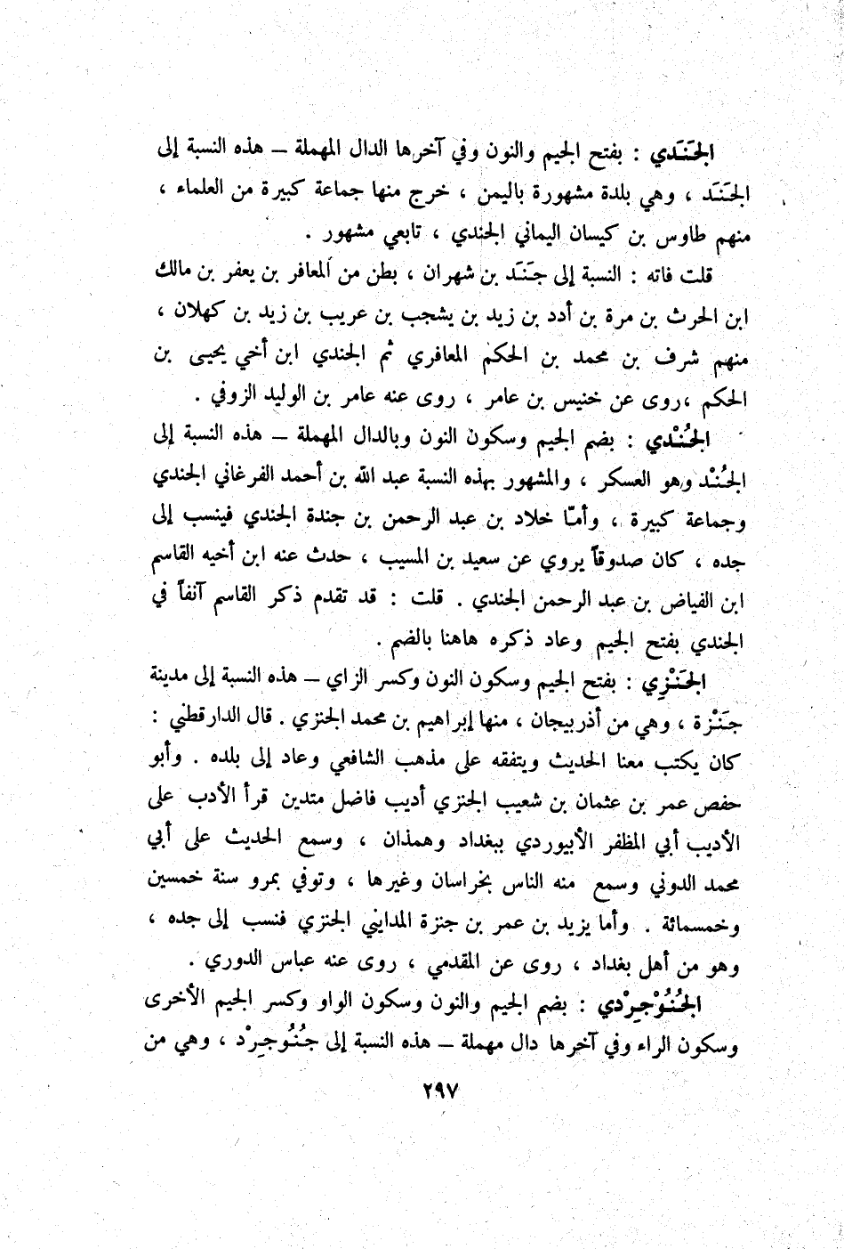 الجندي بِضَم الْجِيم وَسُكُون النُّون وبالدال الْمُهْملَة - هَذِه النِّسْبَة إِلَى الْجند وَهُوَ الْعَسْكَر وَالْمَشْهُور بِهَذِهِ النِّسْبَة عبد الله بن أَحْمد الفرغاني الجندي وَجَمَاعَة كَبِيرَة وَأما خَلاد بن عبد الرَّحْمَن بن جندة الجندي فينسب إِلَى جده كَانَ صَدُوقًا يروي عَن سعيد بن الْمسيب حدث عَنهُ ابْن أَخِيه الْقَاسِم ابْن الْفَيَّاض بن عبد الرَّحْمَن الجندي قلت قد تقدم ذكر الْقَاسِم آنِفا فِي الجندي بِفَتْح الْجِيم وَعَاد ذكره هَاهُنَا بِالضَّمِّ