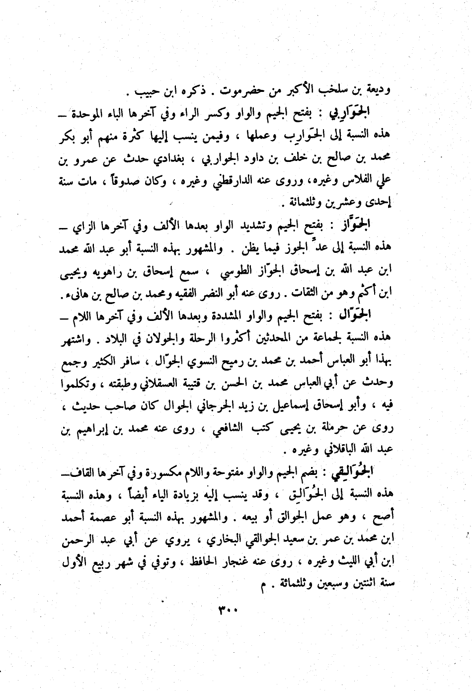 الجواربي بِفَتْح الْجِيم وَالْوَاو وَكسر الرَّاء وَفِي آخرهَا الْبَاء الْمُوَحدَة - هَذِه النِّسْبَة إِلَى الجوارب وعملها وفيمن ينْسب إِلَيْهَا كَثْرَة مِنْهُم أَبُو بكر مُحَمَّد بن صَالح بن خلف بن دَاوُد الجواربي بغدادي حدث عَن عَمْرو بن عَليّ الفلاس وَغَيره وروى عَنهُ الدَّارَقُطْنِيّ وَغَيره وَكَانَ صَدُوقًا مَاتَ سنة إِحْدَى وَعشْرين وثلثمائة