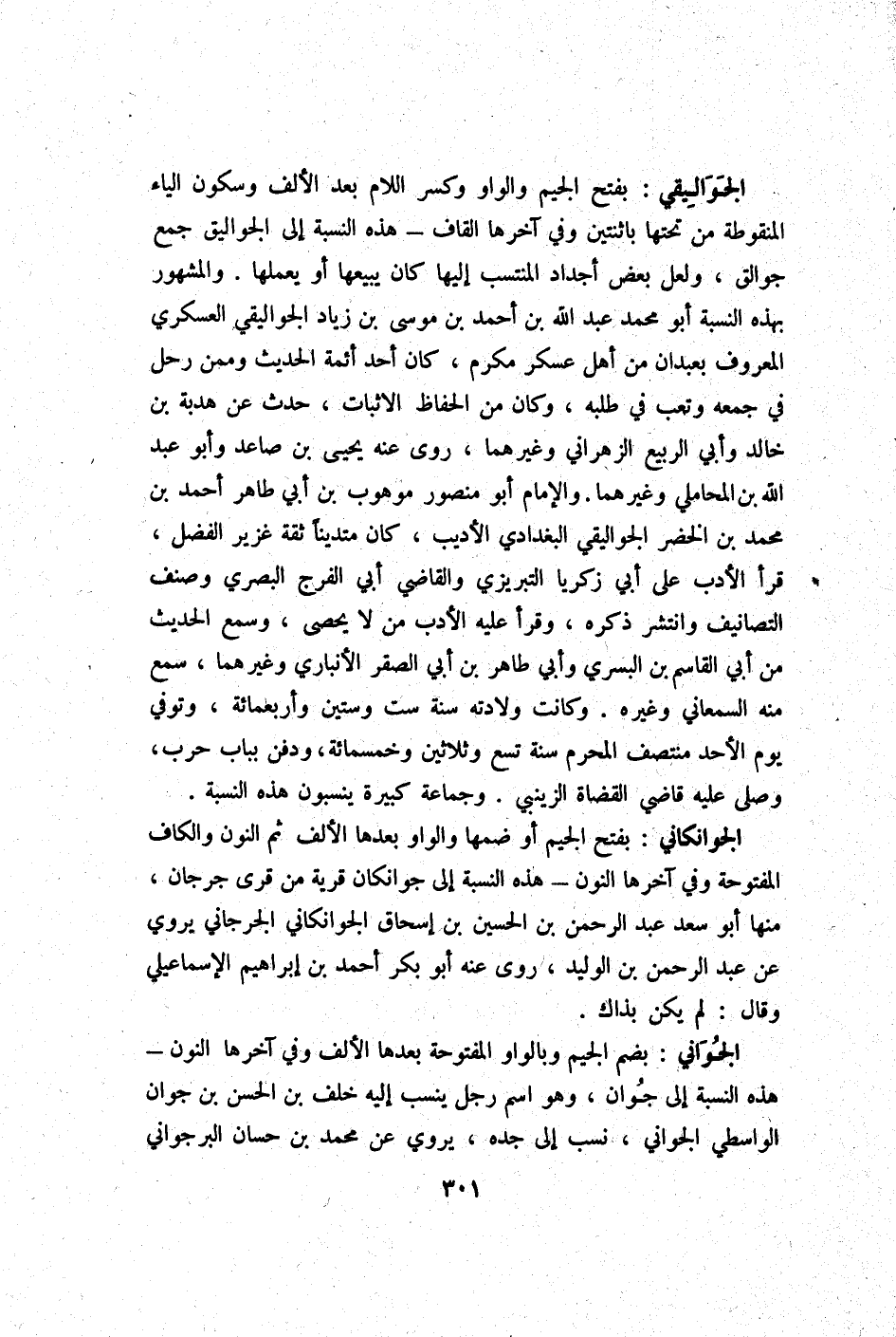 الجواليقي بِفَتْح الْجِيم وَالْوَاو وَكسر اللَّام بعد الْألف وَسُكُون الْيَاء المنقوطة من تحتهَا بِاثْنَتَيْنِ وَفِي آخرهَا الْقَاف - هَذِه النِّسْبَة إِلَى الجواليق جمع جوالق وَلَعَلَّ بعض أجداد المنتسب إِلَيْهَا كَانَ يَبِيعهَا أَو يعملها وَالْمَشْهُور بِهَذِهِ النِّسْبَة ابو مُحَمَّد عبد الله بن أَحْمد بن مُوسَى بن زِيَاد الجواليقي العسكري الْمَعْرُوف بعبدان من أهل عَسْكَر مكرم كَانَ أحد ائمة الحَدِيث وَمِمَّنْ رَحل فِي جمعه وتعب فِي طلبه وَكَانَ من الْحفاظ الاثبات حدث عَن هدبة بن خَالِد وَأبي الرّبيع الزهْرَانِي وَغَيرهمَا روى عَنهُ يحيى بن صاعد وَأَبُو عبد الله بن الْمحَامِلِي وَغَيرهمَا وَالْإِمَام أَبُو مَنْصُور موهوب بن أبي طَاهِر أَحْمد بن مُحَمَّد بن الْخضر الجواليقي الْبَغْدَادِيّ الأديب كَانَ متدينا ثِقَة غزير الْفضل قرا الْأَدَب على أبي زَكَرِيَّا التبريزي وَالْقَاضِي ابي الْفرج الْبَصْرِيّ وصنف التصانيف وانتشر ذكره وَقَرَأَ عَلَيْهِ الْأَدَب من لَا يُحْصى وَسمع الحَدِيث من أبي الْقَاسِم بن البسري وَأبي طَاهِر بن أبي الصَّقْر الْأَنْبَارِي وَغَيرهمَا سمع مِنْهُ السَّمْعَانِيّ وَغَيره وَكَانَت وِلَادَته سنة سِتّ وَسِتِّينَ وَأَرْبَعمِائَة وَتُوفِّي يَوْم الْأَحَد منتصف الْمحرم سنة تسع وَثَلَاثِينَ وَخَمْسمِائة وَدفن بِبَاب حَرْب وَصلى عَلَيْهِ قَاضِي الْقُضَاة الزَّيْنَبِي وَجَمَاعَة كَبِيرَة ينسبون هَذِه النِّسْبَة