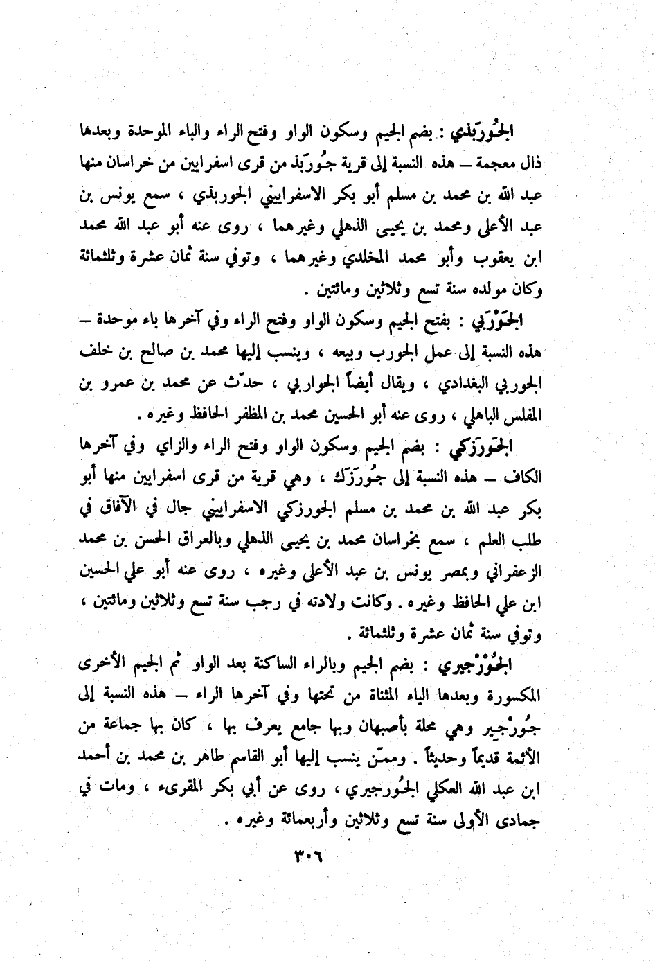 الجوربذي بِضَم الْجِيم وَسُكُون الْوَاو وَفتح الرَّاء وَالْبَاء الْمُوَحدَة وَبعدهَا ذال مُعْجمَة - هَذِه النِّسْبَة إِلَى قَرْيَة جوربذ من قرى اسفرايين من خُرَاسَان مِنْهَا عبد الله بن مُحَمَّد بن مُسلم أَبُو بكر الاسفراييني الجوربذي سمع يُونُس بن عبد الْأَعْلَى وَمُحَمّد بن يحيى الذهلي وَغَيرهمَا روى عَنهُ أَبُو عبد الله مُحَمَّد ابْن يَعْقُوب وَأَبُو مُحَمَّد المخلدي وَغَيرهمَا وَتُوفِّي سنة ثَمَان عشرَة وثلثمائة وَكَانَ مولده سنة تسع وَثَلَاثِينَ وَمِائَتَيْنِ