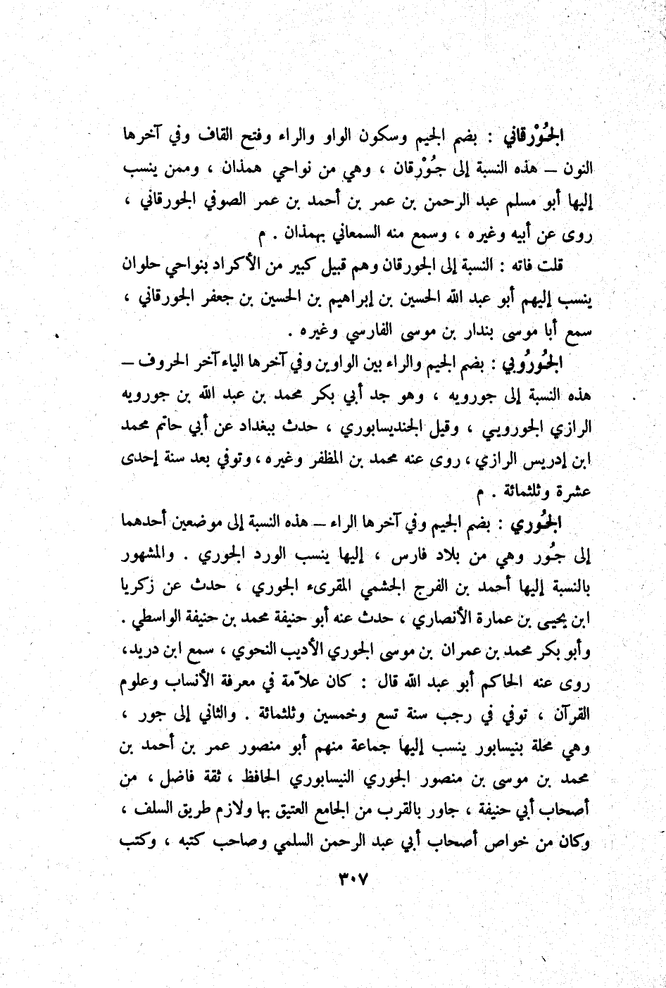 الْجُورِي بِضَم الْجِيم وَفِي آخرهَا الرَّاء - هَذِه النِّسْبَة إِلَى موضِعين أَحدهمَا إِلَى جور وَهِي من بِلَاد فَارس إِلَيْهَا ينْسب الْورْد الْجُورِي وَالْمَشْهُور بِالنِّسْبَةِ إِلَيْهَا أَحْمد بن الْفرج الْجُشَمِي المقرىء الْجُورِي حدث عَن زَكَرِيَّا ابْن يحيى بن عمَارَة الْأنْصَارِيّ حدث عَنهُ أَبُو حنيفَة مُحَمَّد بن حنيفَة الوَاسِطِيّ وَأَبُو بكر مُحَمَّد بن عمرَان بن مُوسَى الْجُورِي الأديب النَّحْوِيّ سمع ابْن دُرَيْد روى عَنهُ الْحَاكِم أَبُو عبد الله قَالَ كَانَ عَلامَة فِي معرفَة الْأَنْسَاب وعلوم الْقُرْآن توفّي فِي رَجَب سنة تسع وَخمسين وثلثمائة وَالثَّانِي إِلَى جور وَهِي محلّة بنيسابور ينْسب إِلَيْهَا جمَاعَة مِنْهُم أَبُو مَنْصُور عمر بن أَحْمد بن مُحَمَّد بن مُوسَى بن مَنْصُور الْجُورِي النَّيْسَابُورِي الْحَافِظ ثِقَة فَاضل من أَصْحَاب أبي حنيفَة جاور بِالْقربِ من الْجَامِع الْعَتِيق بهَا ولازم طَرِيق السّلف وَكَانَ من خَواص أَصْحَاب أبي عبد الرَّحْمَن السّلمِيّ وَصَاحب كتبه وَكتب