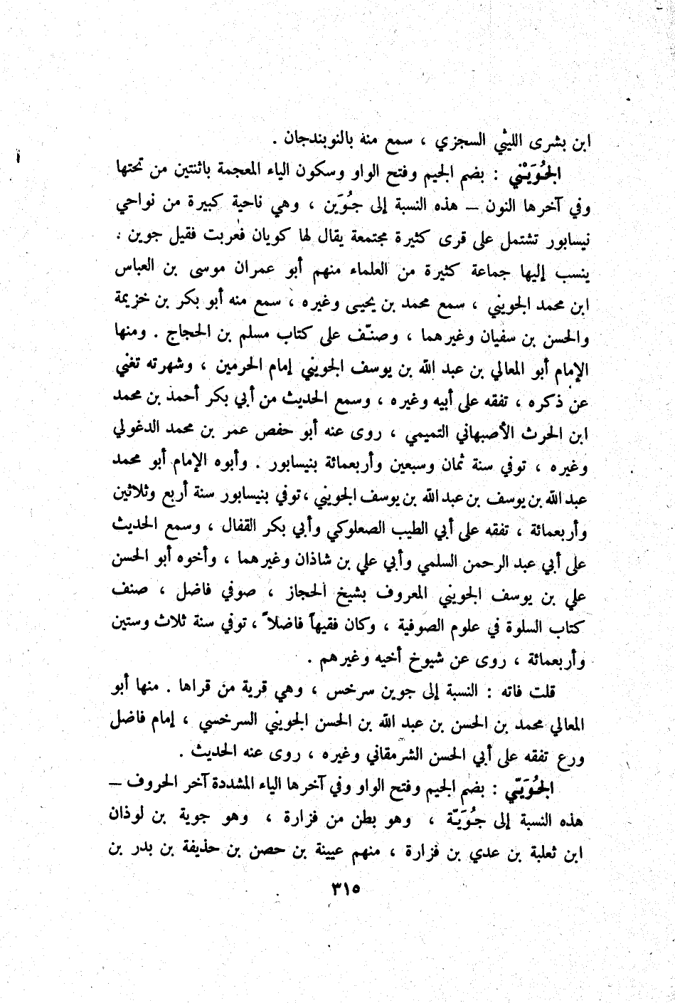 الْجُوَيْنِيّ بِضَم الْجِيم وَفتح الْوَاو وَسُكُون الْيَاء الْمُعْجَمَة بِاثْنَتَيْنِ من تحتهَا وَفِي آخرهَا النُّون - هَذِه النِّسْبَة إِلَى جُوَيْن وَهِي نَاحيَة كَبِيرَة من نواحي نيسابور تشْتَمل على قرى كَثِيرَة مجتمعة يُقَال لَهَا كويان فعربت فَقيل جُوَيْن ينْسب إِلَيْهَا جمَاعَة كَثِيرَة من الْعلمَاء مِنْهُم أَبُو عمرَان مُوسَى بن الْعَبَّاس ابْن مُحَمَّد الْجُوَيْنِيّ سمع مِنْهُ مُحَمَّد بن يحيى وَغَيره سمع مِنْهُ أَبُو بكر بن خُزَيْمَة وَالْحسن بن سُفْيَان وَغَيرهمَا وصنف على كتاب مُسلم بن الْحجَّاج وَمِنْهَا الإِمَام أَبُو الْمَعَالِي بن عبد الله بن يُوسُف الْجُوَيْنِيّ إِمَام الْحَرَمَيْنِ وشهرته تغني عَن ذكره تفقه على أَبِيه وَغَيره وَسمع الحَدِيث من أبي بكر أَحْمد بن مُحَمَّد ابْن الْحَرْث الْأَصْبَهَانِيّ التَّمِيمِي روى عَنهُ أَبُو حَفْص عمر بن مُحَمَّد الدغولي وَغَيره توفّي سنة ثَمَان وَسبعين وَأَرْبَعمِائَة بنيسابور وَأَبوهُ الإِمَام أَبُو مُحَمَّد عبد الله بن يُوسُف بن عبد الله بن يُوسُف الْجُوَيْنِيّ توفّي بنيسابور سنة أَربع وَثَلَاثِينَ وَأَرْبَعمِائَة تفقه على أبي الطّيب الصعلوكي وَأبي بكر الْقفال وَسمع الحَدِيث على أبي عبد الرَّحْمَن السّلمِيّ وَأبي عَليّ بن شَاذان وَغَيرهمَا وَأَخُوهُ أَبُو الْحسن عَليّ بن يُوسُف الْجُوَيْنِيّ الْمَعْرُوف بشيخ الْحجاز صوفي فَاضل صنف كتاب السلوة فِي عُلُوم الصُّوفِيَّة وَكَانَ فَقِيها فَاضلا توفّي سنة ثَلَاث وَسِتِّينَ وَأَرْبَعمِائَة روى عَن شُيُوخ أَخِيه وَغَيرهم