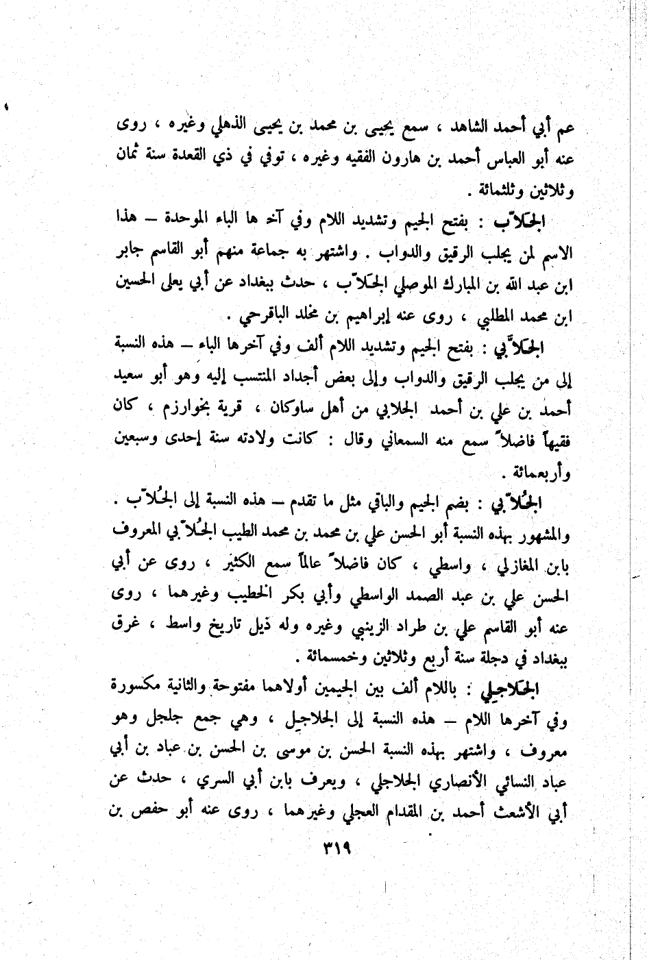 الجلابي بِضَم الْجِيم وَالْبَاقِي مثل مَا تقدم - هَذِه النِّسْبَة إِلَى الْجلاب وَالْمَشْهُور بِهَذِهِ النِّسْبَة أَبُو الْحسن عَليّ بن مُحَمَّد بن مُحَمَّد الطّيب الجلابي الْمَعْرُوف بِابْن المغازلي واسطي كَانَ فَاضلا عَالما سمع الْكثير روى عَن أبي الْحسن عَليّ بن عبد الصَّمد الوَاسِطِيّ وَأبي بكر الْخَطِيب وَغَيرهمَا روى عَنهُ أَبُو الْقَاسِم عَليّ بن طراد الزَّيْنَبِي وَغَيره وَله ذيل تَارِيخ وَاسِط غرق بِبَغْدَاد فِي دجلة سنة أَربع وَثَلَاثِينَ وَخَمْسمِائة