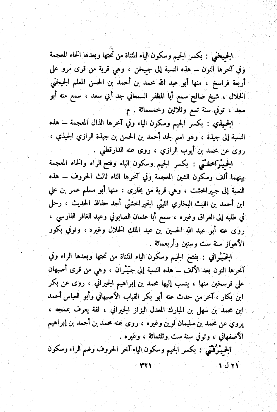 الجيراخشتي بِكَسْر الْجِيم وَسُكُون الْيَاء وَفتح الرَّاء وَالْخَاء الْمُعْجَمَة بَينهمَا ألف وَسُكُون الشين الْمُعْجَمَة وَفِي آخرهَا التَّاء ثَالِث الْحُرُوف - هَذِه النِّسْبَة إِلَى جيراخشت وَهِي قَرْيَة من بُخَارى مِنْهَا أَبُو مُسلم عمر بن عَليّ ابْن أَحْمد بن اللَّيْث البُخَارِيّ اللَّيْثِيّ الجيراخشتي أحد حفاظ الحَدِيث رَحل فِي طلبه إِلَى الْعرَاق وَغَيره سمع أَبَا عُثْمَان الصَّابُونِي وَعبد الغافر الْفَارِسِي روى عَنهُ أَبُو عبد الله الْحُسَيْن بن عبد الْملك الْخلال وَغَيره وَتُوفِّي بكور الأهواز سنة سِتّ وَسِتِّينَ وَأَرْبَعمِائَة