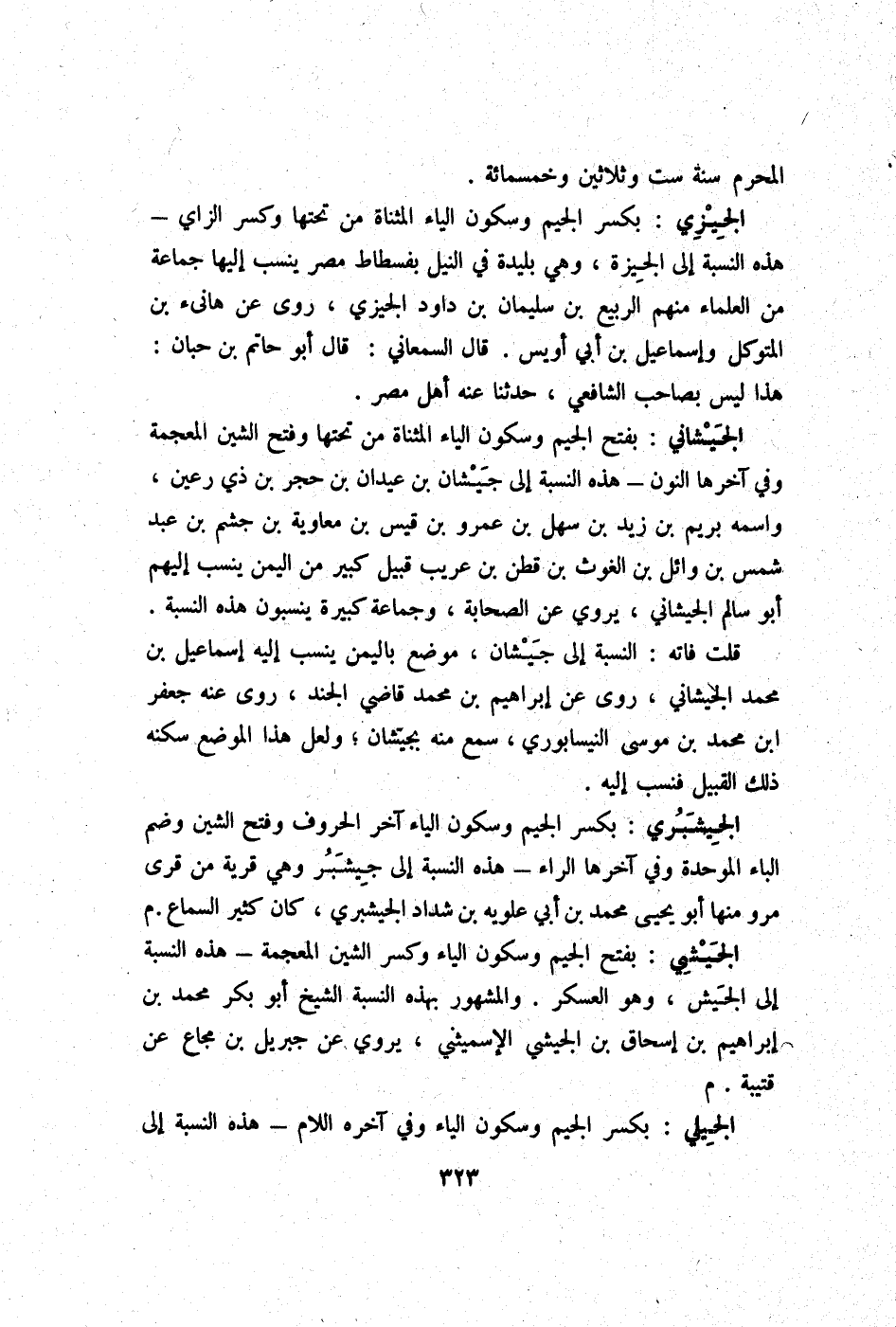قلت فَاتَهُ النِّسْبَة إِلَى جيشان مَوضِع بِالْيمن ينْسب إِلَيْهِ إِسْمَاعِيل بن مُحَمَّد الجيشاني روى عَن إِبْرَاهِيم بن مُحَمَّد قَاضِي الْجند روى عَنهُ جَعْفَر ابْن مُحَمَّد بن مُوسَى النَّيْسَابُورِي سمع مِنْهُ بجيشان وَلَعَلَّ هَذَا الْموضع سكنه ذَلِك الْقَبِيل فنسب إِلَيْهِ