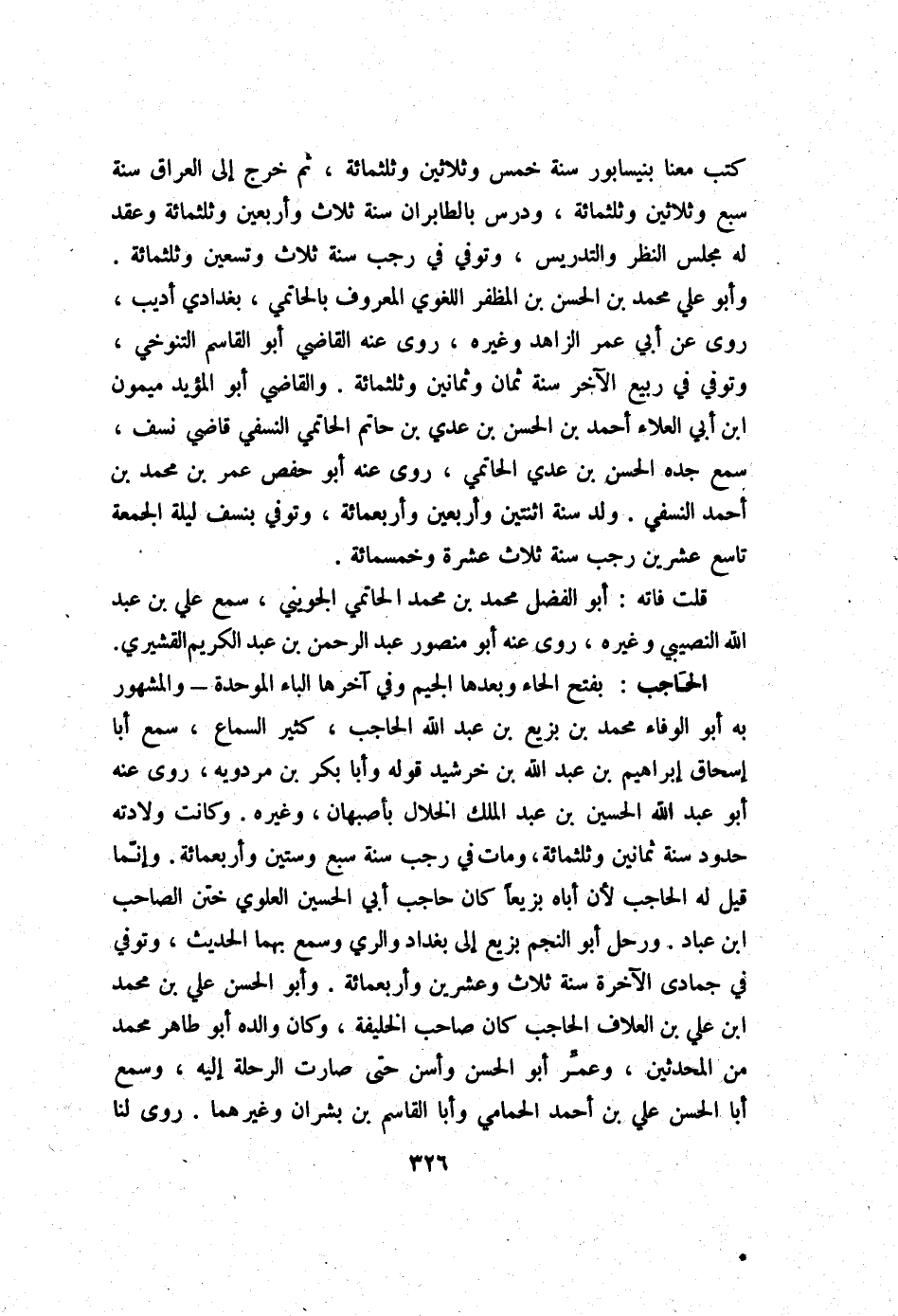 كتب مَعنا بنيسابور سنة خمس وَثَلَاثِينَ وثلثمائة ثمَّ خرج إِلَى الْعرَاق سنة سبع وَثَلَاثِينَ وثلثمائة ودرس بالطابران سنة ثَلَاث وَأَرْبَعين وثلثمائة وَعقد لَهُ مجْلِس النّظر والتدريس وَتُوفِّي فِي رَجَب سنة ثَلَاث وَتِسْعين وثلثمائة وَأَبُو عَليّ مُحَمَّد بن الْحسن بن المظفر اللّغَوِيّ الْمَعْرُوف بالحاتمي بغدادي أديب روى عَن أبي عمر الزَّاهِد وَغَيره روى عَنهُ القَاضِي أَبُو الْقَاسِم التنوخي وَتُوفِّي فِي ربيع الآخر سنة ثَمَان وَثَمَانِينَ وثلثمائة وَالْقَاضِي أَبُو الْمُؤَيد مَيْمُون ابْن أبي الْعَلَاء أَحْمد بن الْحسن بن عدي بن حَاتِم الْحَاتِمِي النَّسَفِيّ قَاضِي نسف سمع جده الْحسن بن عدي الْحَاتِمِي روى عَنهُ أَبُو حَفْص عمر بن مُحَمَّد بن أَحْمد النَّسَفِيّ ولد سنة اثْنَتَيْنِ وَأَرْبَعين وَأَرْبَعمِائَة وَتُوفِّي بنسف لَيْلَة الْجُمُعَة تَاسِع عشْرين رَجَب سنة ثَلَاث عشرَة وَخَمْسمِائة