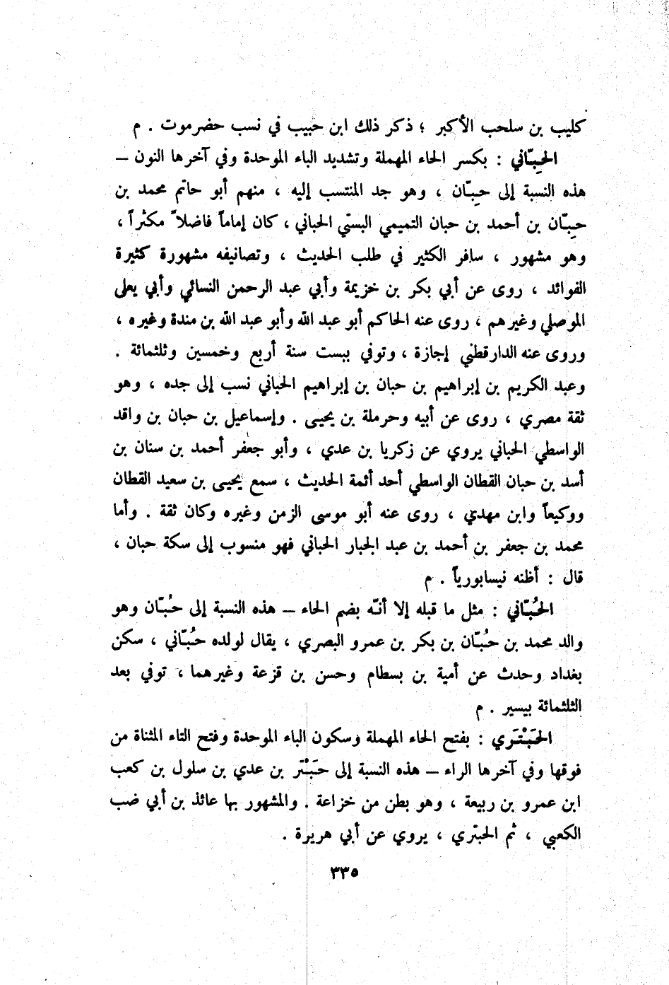 الحباني مثل مَا قبله إِلَى أَنه بِضَم الْحَاء - هَذِه النِّسْبَة إِلَى حبَان وَهُوَ وَالِد مُحَمَّد بن حبَان بن بكر بن عَمْرو الْبَصْرِيّ يُقَال لوَلَده حباني سكن بَغْدَاد وَحدث عَن أُميَّة بن بسطَام وَحسن بن قزعة وَغَيرهمَا توفّي بعد الثلثمائة بِيَسِير م