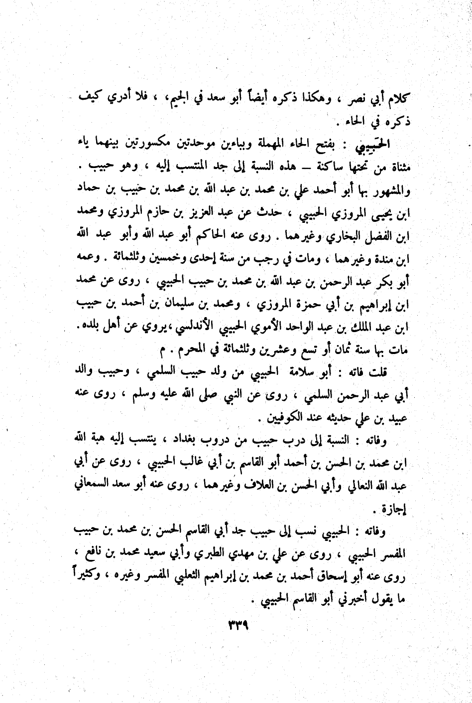 وَفَاته الحبيبي نسب إِلَى حبيب جد ابي الْقَاسِم الْحسن بن مُحَمَّد بن حبيب الْمُفَسّر الحبيبي روى عَن عَليّ بن مهْدي الطَّبَرِيّ وابي سعيد مُحَمَّد بن نَافِع روى عَنهُ أَبُو إِسْحَاق أَحْمد بن مُحَمَّد بن إِبْرَاهِيم الثَّعْلَبِيّ الْمُفَسّر وَغَيره وَكَثِيرًا مَا يَقُول أَخْبرنِي أَبُو الْقَاسِم الحبيبي