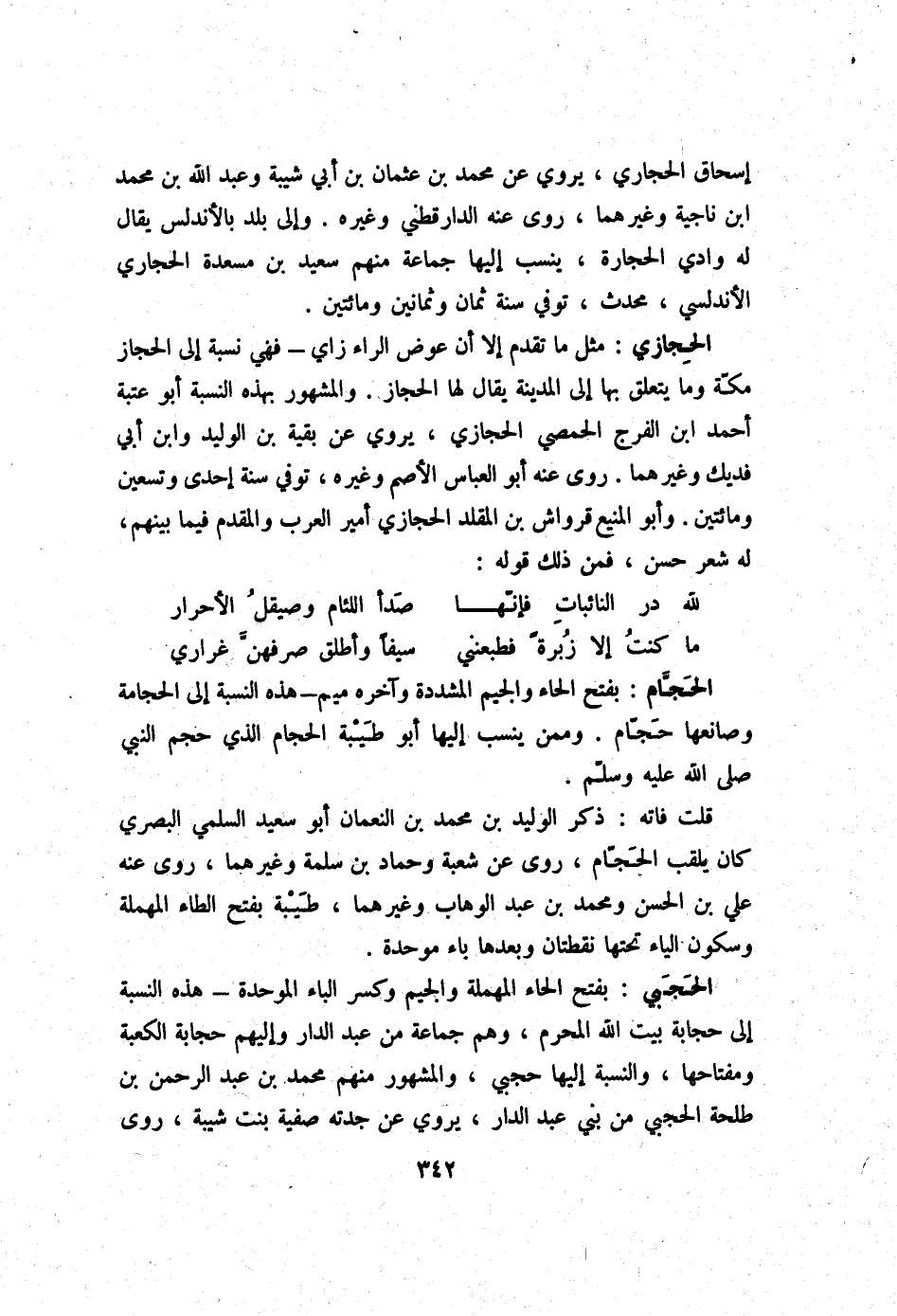 الْحِجَازِي مثل مَا تقدم إِلَّا أَن عوض الرَّاء زَاي - فَهِيَ نِسْبَة إِلَى الْحجاز مَكَّة وَمَا يتَعَلَّق بهَا إِلَى الْمَدِينَة يُقَال لَهَا الْحجاز وَالْمَشْهُور بِهَذِهِ النِّسْبَة أَبُو عتبَة أَحْمد ابْن الْفرج الْحِمصِي الْحِجَازِي يروي عَن بَقِيَّة بن الْوَلِيد وَابْن أبي فديك وَغَيرهمَا روى عَنهُ أَبُو الْعَبَّاس الْأَصَم وَغَيره توفّي سنة إِحْدَى وَتِسْعين وَمِائَتَيْنِ وَأَبُو المنيع قرواش بن الْمُقَلّد الْحِجَازِي أَمِير الْعَرَب والمقدم فِيمَا بَينهم لَهُ شعر حسن فَمن ذَلِك قَوْله