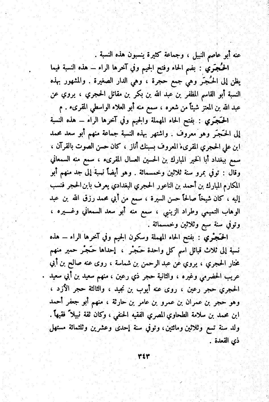 الحجري بِفَتْح الْحَاء الْمُهْملَة وَسُكُون الْجِيم وَفِي آخرهَا الرَّاء - هَذِه نِسْبَة إِلَى ثَلَاث قبائل اسْم كل وَاحِدَة حجر إِحْدَاهَا حجر حمير مِنْهُم مُخْتَار الحجري يروي عَن عبد الرَّحْمَن بن شماسَة روى عَنهُ صَالح بن أبي عريب الْحَضْرَمِيّ وَغَيره وَالثَّانيَِة حجر ذِي رعين مِنْهُم سعيد بن ابي سعيد الحجري حجر رعين روى عَنهُ أَيُّوب بن نجيد وَالثَّالِثَة حجر الأزد وَهُوَ حجر بن عمرَان بن عَمْرو بن عَامر بن حَارِثَة مِنْهُم أَبُو جَعْفَر أَحْمد ابْن مُحَمَّد بن سَلامَة الطَّحَاوِيّ الْمصْرِيّ الْفَقِيه الْحَنَفِيّ وَكَانَ ثِقَة نبيلا فَقِيها ولد سنة تسع وَثَلَاثِينَ وَمِائَتَيْنِ وَتُوفِّي سنة إِحْدَى وَعشْرين وثلثمائة مستهل ذِي الْقعدَة