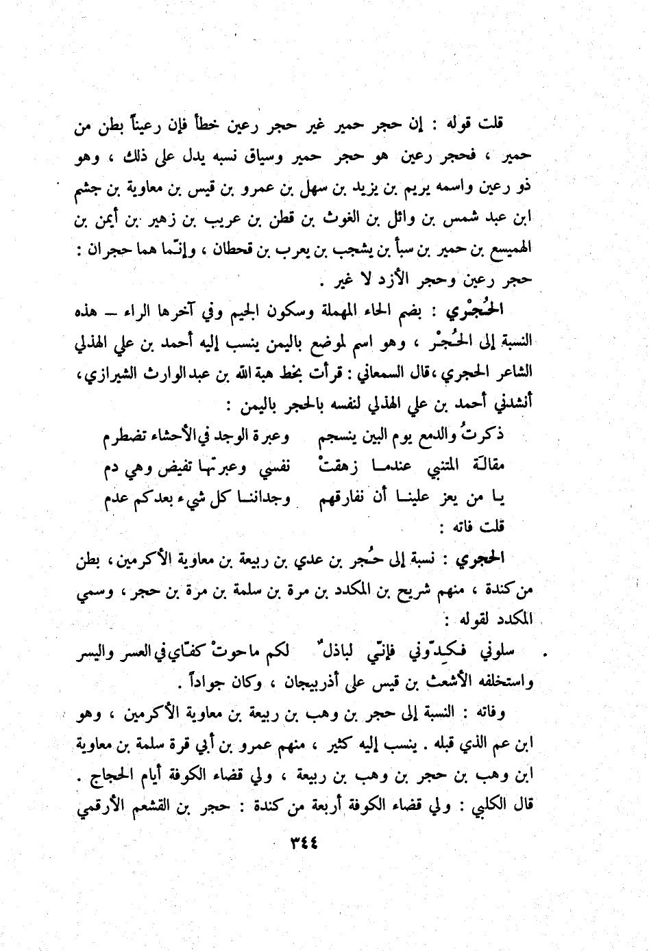 الحجري نِسْبَة إِلَى حجر بن عدي بن ربيعَة بن مُعَاوِيَة الأكرمين بطن من كِنْدَة مِنْهُم شُرَيْح بن المكدد بن مرّة بن سَلمَة بن مرّة بن حجر وَسمي المكدد لقَوْله