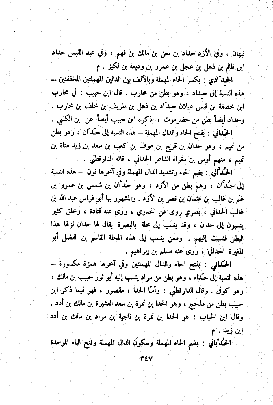 الْحدانِي بِفَتْح الْحَاء وَالدَّال الْمُهْملَة - هَذِه النِّسْبَة إِلَى حدان وَهُوَ بطن من تَمِيم وَهُوَ حدان بن قريع بن عَوْف بن كَعْب بن سعد بن زيد مَنَاة بن تَمِيم مِنْهُم أَوْس بن مغراء الشَّاعِر الْحدانِي قَالَه الدَّارَقُطْنِيّ