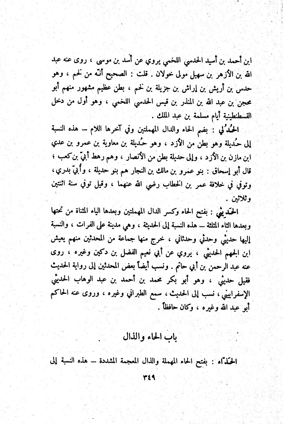 الحديثي بِفَتْح الْحَاء وَكسر الدَّال الْمُهْمَلَتَيْنِ وَبعدهَا الْيَاء الْمُثَنَّاة من تحتهَا وَبعدهَا الثَّاء الْمُثَلَّثَة - هَذِه النِّسْبَة إِلَى الحديثة وَهِي مَدِينَة على الْفُرَات وَالنِّسْبَة إِلَيْهَا حَدِيثي وحدثي وحدثاني خرج مِنْهَا جمَاعَة من الْمُحدثين مِنْهُم يعِيش ابْن الجهم الحديثي يروي عَن أبي نعيم الْفضل بن دُكَيْن وَغَيره روى عَنهُ عبد الرَّحْمَن بن ابي حَاتِم وَنسب أَيْضا بعض الْمُحدثين إِلَى رِوَايَة الحَدِيث فَقيل حَدِيثي وَهُوَ أَبُو بكر مُحَمَّد بن أَحْمد بن عبد الْوَهَّاب الحديثي الإِسْفِرَايِينِيّ نسب إِلَى الحَدِيث سمع الطَّبَرَانِيّ وَغَيره وروى عَنهُ الْحَاكِم أَبُو عبد الله وَغَيره وَكَانَ حَافِظًا