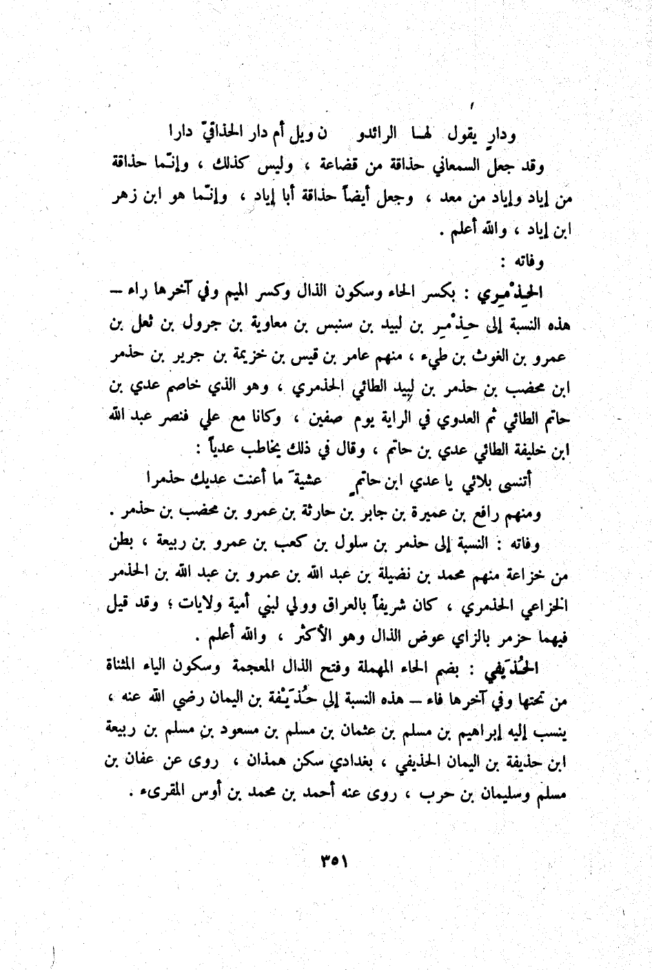 وَفَاته النِّسْبَة إِلَى حذمر بن سلول بن كَعْب بن عَمْرو بن ربيعَة بطن من خُزَاعَة مِنْهُم مُحَمَّد بن نضيلة بن عبد الله بن عَمْرو بن عبد الله بن الحذمر الْخُزَاعِيّ الحذمري كَانَ شريفا بالعراق وَولي لبني أُميَّة ولايات وَقد قيل فيهمَا حزمر بالزاي عوض الذَّال وَهُوَ الْأَكْثَر وَالله أعلم