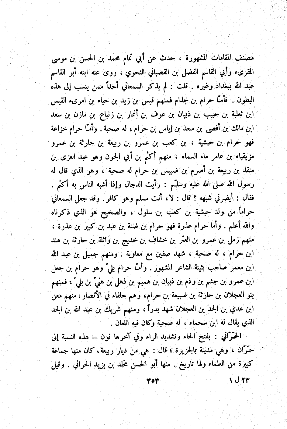 مُصَنف المقامات الْمَشْهُورَة حدث عَن أبي تَمام مُحَمَّد بن الْحسن بن مُوسَى المقرىء وَأبي الْقَاسِم الْفضل بن القصباني النَّحْوِيّ روى عَنهُ ابْنه أَبُو الْقَاسِم عبد الله بِبَغْدَاد وَغَيره قلت لم يذكر السَّمْعَانِيّ أحدا مِمَّن ينْسب إِلَى هَذِه الْبُطُون فَأَما حرَام بن جذام فَمنهمْ قيس بن زيد بن حَيَاء بن امرىء الْقَيْس ابْن ثَعْلَبَة بن حبيب بن ذبيان بن عَوْف بن أَنْمَار بن زنباع بن مَازِن بن سعد ابْن مَالك بن أفصى بن سعد بن إِيَاس بن حرَام لَهُ صُحْبَة وَأما حرَام خُزَاعَة فَهُوَ حرَام بن حبشية بن كَعْب بن عَمْرو بن ربيعَة بن حَارِثَة بن عَمْرو مزيقياء بن عَامر مَاء السَّمَاء مِنْهُم أَكْثَم بن أبي الجون وَهُوَ عبد الْعُزَّى بن منقذ بن ربيعَة بن أَصْرَم بن ضبيس بن حرَام لَهُ صُحْبَة وَهُوَ الَّذِي قَالَ لَهُ رَسُول الله صلى الله عَلَيْهِ وَسلم رَأَيْت الدَّجَّال وَإِذا أشبه النَّاس بِهِ أَكْثَم فَقَالَ أيضرني شبهه قَالَ لَا أَنْت مُسلم وَهُوَ كَافِر وَقد جعل السَّمْعَانِيّ حَرَامًا من ولد حبشية بن كَعْب بن سلول وَالصَّحِيح هُوَ الَّذِي ذَكرْنَاهُ وَالله أعلم وَأما حرَام عذرة فَهُوَ حرَام بن ضنة بن عبد بن 4 كَبِير بن عذرة مِنْهُم زمل بن عَمْرو بن العتر بن خشاف بن خديج بن وَاثِلَة بن حَارِثَة بن هِنْد ابْن حرَام لَهُ صُحْبَة شهد صفّين مَعَ مُعَاوِيَة وَمِنْهُم جميل بن عبد الله ابْن معمر صَاحب بثينة الشَّاعِر الْمَشْهُور وَأما حرَام بلي وَهُوَ حرَام بن جعل ابْن عَمْرو بن جشم بن وذم بن ذبيان بن هميم بن ذهل بن هني بن بلي فَمنهمْ بَنو العجلان بن حَارِثَة بن ضبيعة بن حرَام وهم حلفاء فِي الْأَنْصَار مِنْهُم معن ابْن عدي بن الْجد بن العجلان شهد بَدْرًا وَمِنْهُم شريك بن عبد الله بن الْجد الَّذِي يُقَال لَهُ ابْن سَحْمَاء لَهُ صُحْبَة وَكَانَ فِيهِ اللّعان
