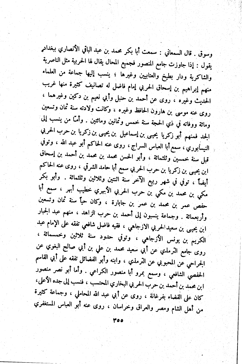 وسوق قَالَ السَّمْعَانِيّ سَمِعت أَبَا بكر مُحَمَّد بن عبد الْبَاقِي الْأنْصَارِيّ بِبَغْدَاد يَقُول إِذا جَاوَزت جَامع الْمَنْصُور فَجَمِيع الْمحَال يُقَال لَهَا الحربية مثل الناصرية والشاكرية وَدَار بطيخ والعتابيين وَغَيرهَا ينْسب إِلَيْهَا جمَاعَة من الْعلمَاء مِنْهُم إِبْرَاهِيم بن إِسْحَاق الْحَرْبِيّ إِمَام فَاضل لَهُ تصانيف كَثِيرَة مِنْهَا غَرِيب الحَدِيث وَغَيره روى عَن أَحْمد بن حَنْبَل وَأبي نعيم بن دُكَيْن وَغَيرهمَا روى عَنهُ مُوسَى بن هَارُون الْحَافِظ وَغَيره وَكَانَت وِلَادَته سنة ثَمَان وَتِسْعين وَمِائَة ووفاته فِي ذِي الْحجَّة سنة خمس وَثَمَانِينَ وَمِائَتَيْنِ وَأما من ينْسب إِلَى الْجد فَمنهمْ أَبُو زَكَرِيَّا يحيى بن إِسْمَاعِيل بن يحيى بن زَكَرِيَّا بن حَرْب الْحَرْبِيّ النَّيْسَابُورِي سمع أَبَا الْعَبَّاس السراج روى عَنهُ الْحَاكِم أَبُو عبد الله وَتُوفِّي قبل سنة خمسين وثلثمائة وَأَبُو الْحسن مُحَمَّد بن مُحَمَّد بن أَحْمد بن إِسْحَاق ابْن يحيى بن زَكَرِيَّا بن حَرْب الْحَرْبِيّ سمع أَبَا حَامِد الشَّرْقِي روى عَنهُ الْحَاكِم أَيْضا توفّي فِي شهر ربيع الآخر سنة اثْنَتَيْنِ وَثَلَاثِينَ وثلثمائة وَأَبُو بكر مكي بن مُحَمَّد بن مكي بن حَرْب الْحَرْبِيّ الْأَبْهَرِيّ خطيب أبهر سمع أَبَا حَفْص عمر بن مُحَمَّد بن عمر بن جابارة وَكَانَ حَيا سنة ثَمَان وَتِسْعين وَأَرْبَعمِائَة وَجَمَاعَة ينسبون إِلَى أَحْمد بن حَرْب الزَّاهِد مِنْهُم عبد الْجَبَّار ابْن يحيى بن سعيد الْحَرْبِيّ الأزجاهي فَقِيه فَاضل شَافِعِيّ تفقه على الإِمَام عبد الْكَرِيم بن يُونُس الأزجاهي وَتُوفِّي حُدُود سنة ثَلَاثِينَ وَخَمْسمِائة روى جَامع التِّرْمِذِيّ عَن أبي سعيد مُحَمَّد بن عَليّ بن أبي صَالح الْبَغَوِيّ عَن الجراحي عَن المحبوبي عَن التِّرْمِذِيّ وَابْنه وَأَبُو الْفَضَائِل تفقه على أبي الْقَاسِم الحفصي الشَّافِعِي وَسمع بمرو أَبَا مَنْصُور الكراعي وَأما أَبُو نصر مَنْصُور ابْن مُحَمَّد بن أَحْمد بن حَرْب الْحَرْبِيّ البُخَارِيّ الْمُحْتَسب فنسب إِلَى جده الْأَعْلَى كَانَ على الْقَضَاء بفرغانة روى عَن أبي عبد الله الْمحَامِلِي وَجَمَاعَة كَثِيرَة من أهل الشَّام ومصر وَالْعراق وخراسان روى عَنهُ أَبُو الْعَبَّاس المستغفري