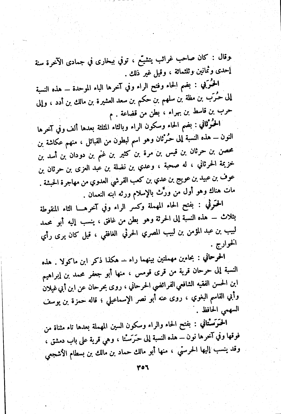 الحرثاني بِضَم الْحَاء وَسُكُون الرَّاء وبالثاء الْمُثَلَّثَة بعْدهَا ألف وَفِي آخرهَا النُّون - هَذِه النِّسْبَة إِلَى حرثان وَهُوَ اسْم لبطون من الْقَبَائِل مِنْهُم عكاشة بن مُحصن بن حرثان بن قيس بن مرّة بن كثير بن غنم بن دودان بن أَسد بن خُزَيْمَة الحرثاني لَهُ صُحْبَة وعدي بن نَضْلَة بن عبد الْعُزَّى بن حرثان بن عَوْف بن عبيد بن عويج بن عدي بن كَعْب الْقرشِي الْعَدوي من مهاجرة الْحَبَشَة مَاتَ هُنَاكَ وَهُوَ أول من ورث بِالْإِسْلَامِ وَرثهُ ابْنه النُّعْمَان