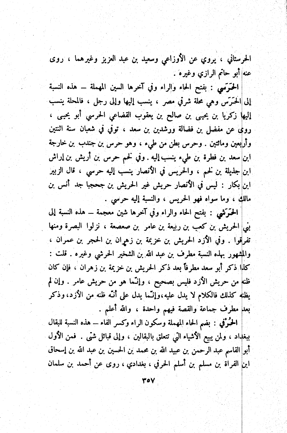 الحرسي بِفَتْح الْحَاء وَالرَّاء وَفِي آخرهَا السِّين الْمُهْملَة - هَذِه النِّسْبَة إِلَى الحرس هِيَ محلّة شَرْقي مصر ينْسب إِلَيْهَا وَإِلَى رجل فالمحلة ينْسب إِلَيْهَا زَكَرِيَّا بن يحيى بن صَالح بن يَعْقُوب الْقُضَاعِي الحرسي أَبُو يحيى روى عَن مفضل بن فضَالة وَرشْدِين بن سعد توفّي فِي شعْبَان سنة اثْنَتَيْنِ وَأَرْبَعين وَمِائَتَيْنِ وحرس بطن من طَيء وَهُوَ حرس بن جُنْدُب بن خَارِجَة ابْن سعد بن فطْرَة بن طَيء ينْسب إِلَيْهِ وَفِي لخم حرس بن أريش بن إراش ابْن جذيلة بن لخم والحريس فِي الْأَنْصَار ينْسب إِلَيْهِ حرسي قَالَ الزبير ابْن بكار لَيْسَ فِي الْأَنْصَار حريش غير الْحَرِيش بن جحجبا جد أنس بن مَالك وَمَا سواهُ فَهُوَ الحريس وَالنِّسْبَة إِلَيْهِ حرسي