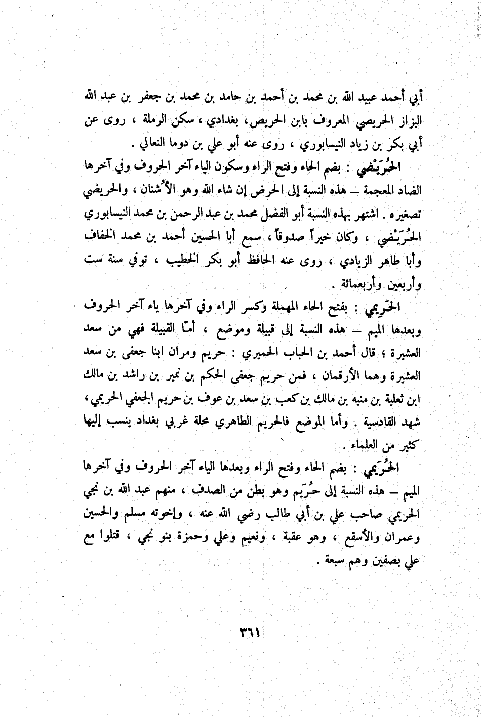 الحريمي بِفَتْح الْحَاء الْمُهْملَة وَكسر الرَّاء وَفِي آخرهَا يَاء آخر الْحُرُوف وَبعدهَا الْمِيم - هَذِه النِّسْبَة إِلَى قَبيلَة وَمَوْضِع أما الْقَبِيلَة فَهِيَ من سعد الْعَشِيرَة قَالَ أَحْمد بن الْحباب الْحِمْيَرِي حَرِيم ومران ابْنا جعفى بن سعد الْعَشِيرَة وهما الأرقمان فَمن حَرِيم جعفى الحكم بن نمير بن رَاشد بن مَالك ابْن ثَعْلَبَة بن مُنَبّه بن مَالك بن كَعْب بن سعد بن عَوْف بن حَرِيم الْجعْفِيّ الحريمي شهد الْقَادِسِيَّة وَأما الْموضع فالحريم الطاهري محلّة غربي بَغْدَاد ينْسب إِلَيْهَا كثير من الْعلمَاء