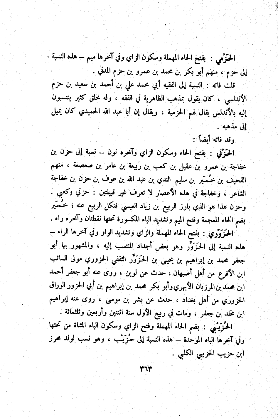 الحزمي بِفَتْح الْحَاء الْمُهْملَة وَسُكُون الزَّاي وَفِي آخرهَا مِيم - هَذِه النِّسْبَة إِلَى حزم مِنْهُم أَبُو بكر بن مُحَمَّد بن عَمْرو بن حزم الْمدنِي