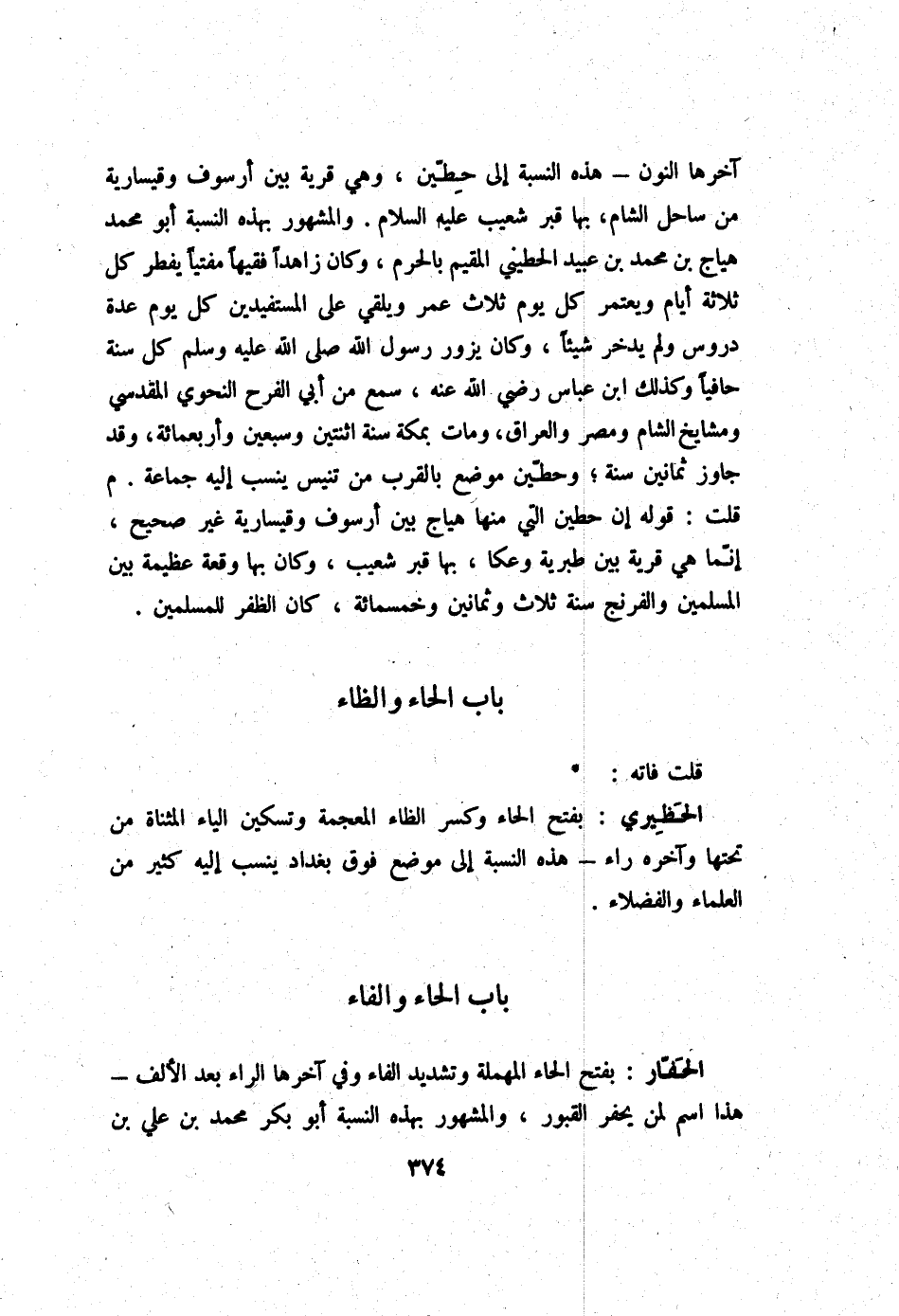 آخرهَا النُّون - هَذِه النِّسْبَة إِلَى حطين وَهِي قَرْيَة بَين أرسوف وقيسارية من سَاحل الشَّام بهَا قبر شُعَيْب عَلَيْهِ السَّلَام وَالْمَشْهُور بِهَذِهِ النِّسْبَة أَبُو مُحَمَّد هياج بن مُحَمَّد بن عبيد الحطيني الْمُقِيم بِالْحرم وَكَانَ زاهدا فَقِيها مفتيا يفْطر كل ثَلَاثَة أَيَّام ويعتمر كل يَوْم ثَلَاث عمر ويلقي على المستفيدين كل يَوْم عدَّة دروس وَلم يدّخر شَيْئا وَكَانَ يزور رَسُول الله صلى الله عَلَيْهِ وَسلم كل سنة حافيا وَكَذَلِكَ ابْن عَبَّاس رَضِي الله عَنهُ سمع من أبي الْفَرح النَّحْوِيّ الْمَقْدِسِي ومشايخ الشَّام ومصر وَالْعراق وَمَات بِمَكَّة سنة اثْنَتَيْنِ وَسبعين وَأَرْبَعمِائَة وَقد جَاوز ثَمَانِينَ سنة وحطين مَوضِع بِالْقربِ من تنيس ينْسب إِلَيْهِ جمَاعَة م قلت قَوْله إِن حطين الَّتِي مِنْهَا هياج بَين أرسوف وقيسارية غير صَحِيح إِنَّمَا هِيَ قَرْيَة بَين طبرية وعكا بهَا قبر شُعَيْب وَكَانَ بهَا وقْعَة عَظِيمَة بَين الْمُسلمين والفرنج سنة ثَلَاث وَثَمَانِينَ وَخَمْسمِائة كَانَ الظفر للْمُسلمين